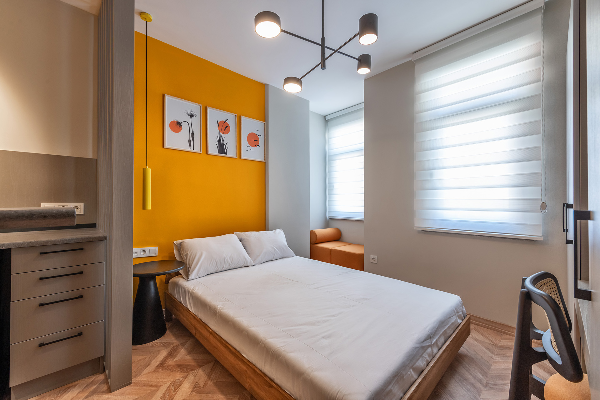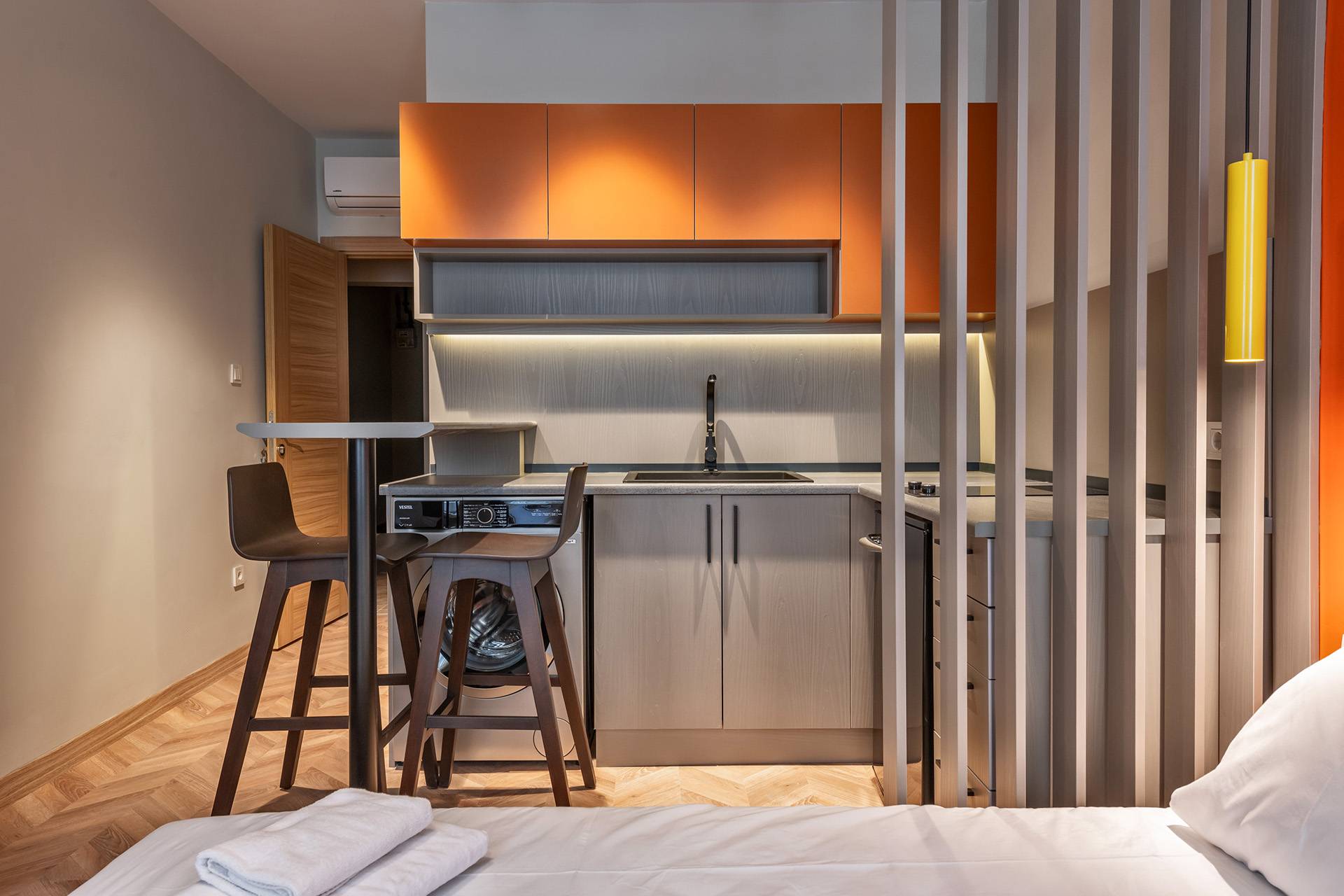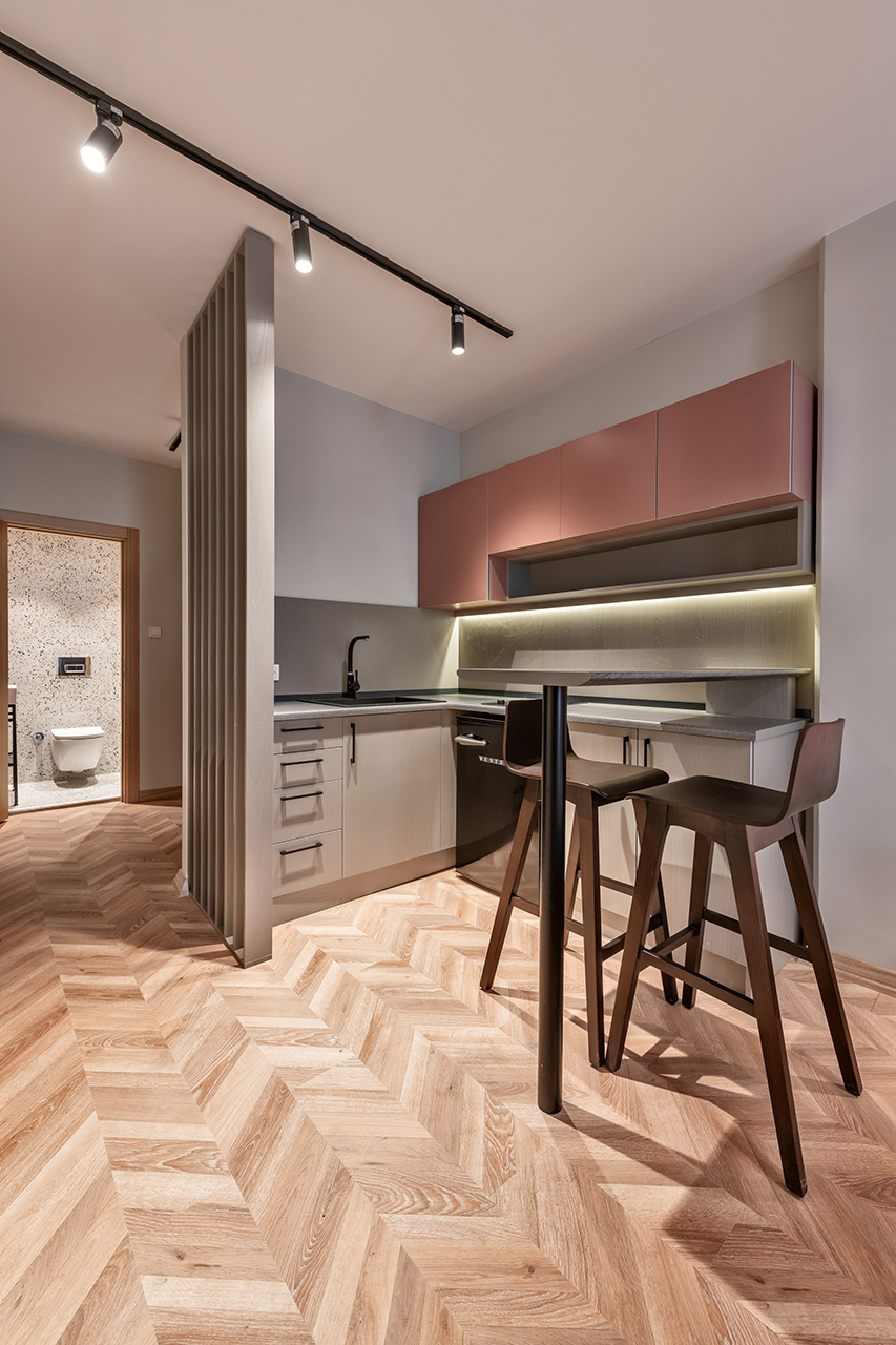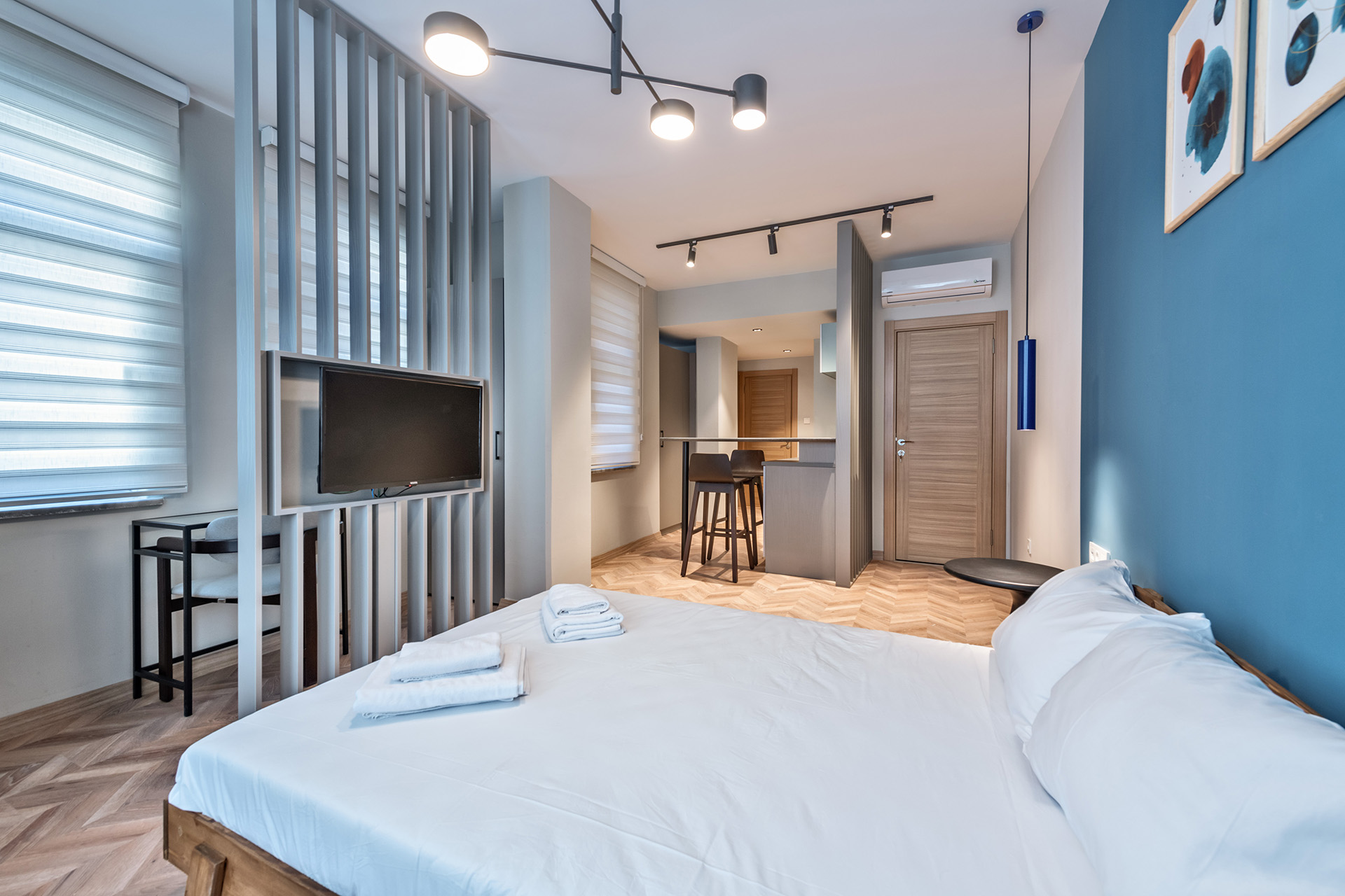 Modern stüdyo daire koleksiyonumuz, akıllı planlama ve cesur renk bloklarıyla fonksiyonelliği estetikle buluşturarak benzersiz bir mimari yaklaşım sunuyor. Ahşap bölücüler ve kompakt mutfaklar gibi detaylar, alanı en üst düzeye çıkarırken her birime özgün bir karakter kazandırıyor. Konforlu mobilyalar ve çağdaş aydınlatma ile tamamlanan bu mekanlar, misafirlere kişiselleştirilmiş ve yüksek kaliteli bir konaklama deneyimi vadediyor.