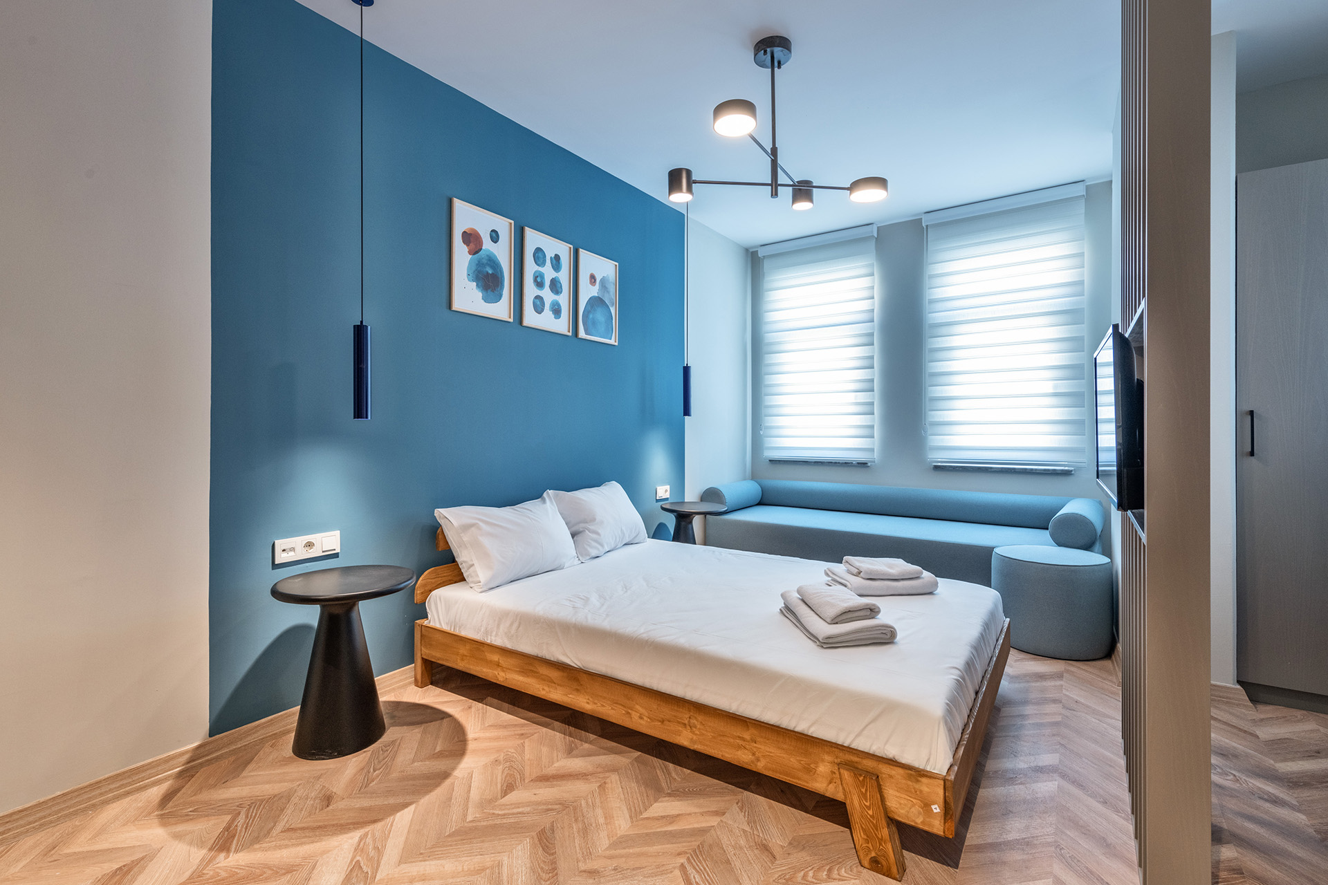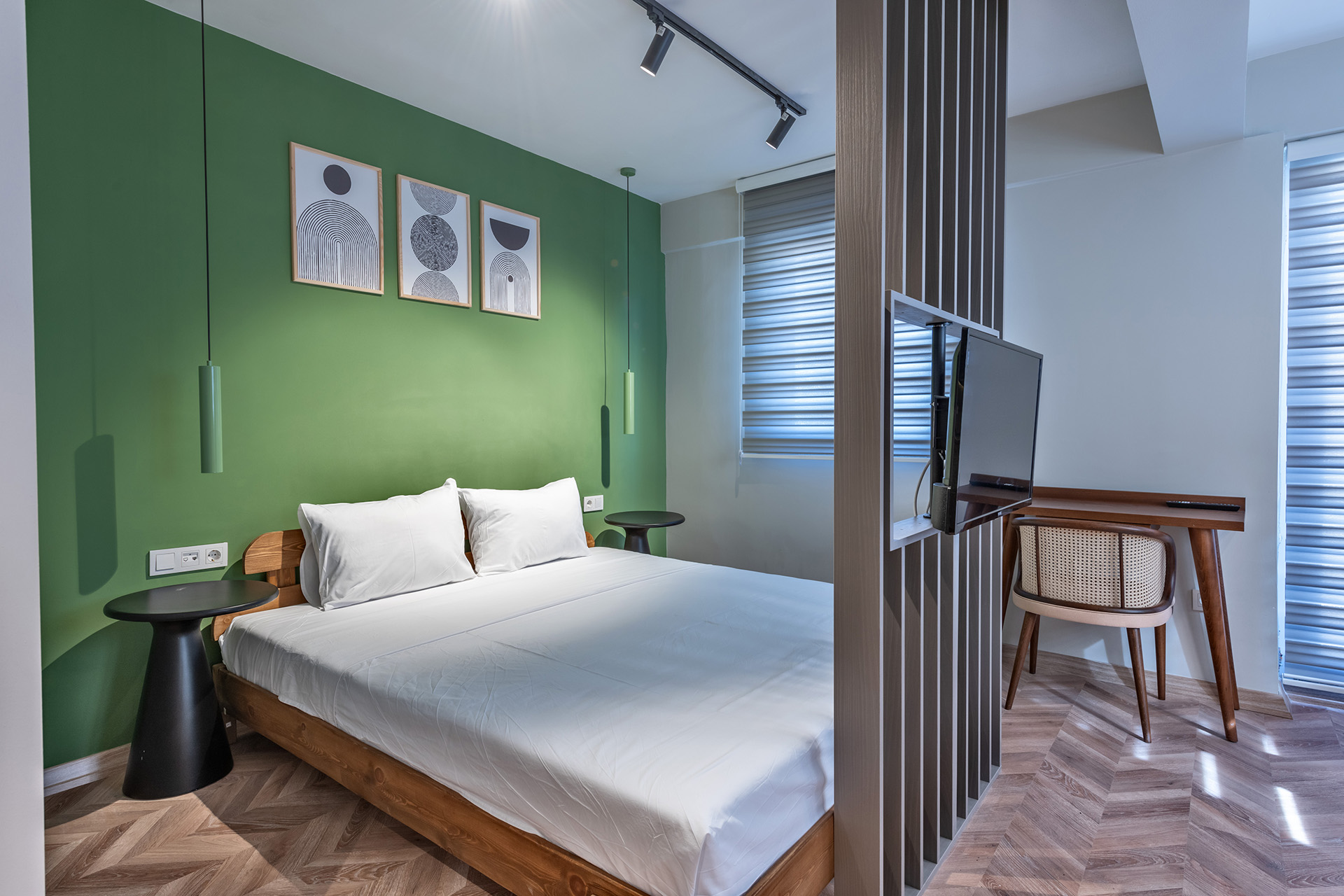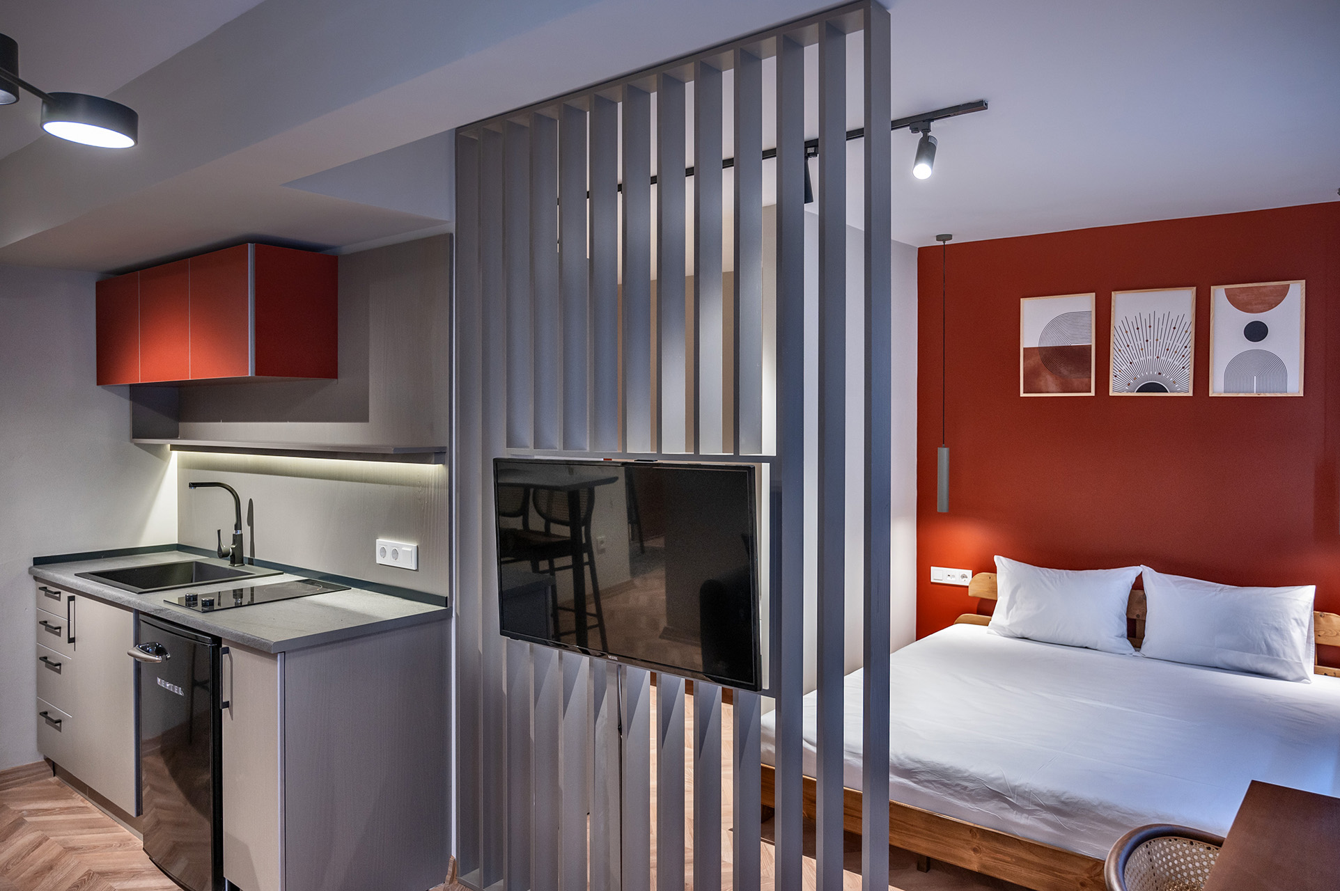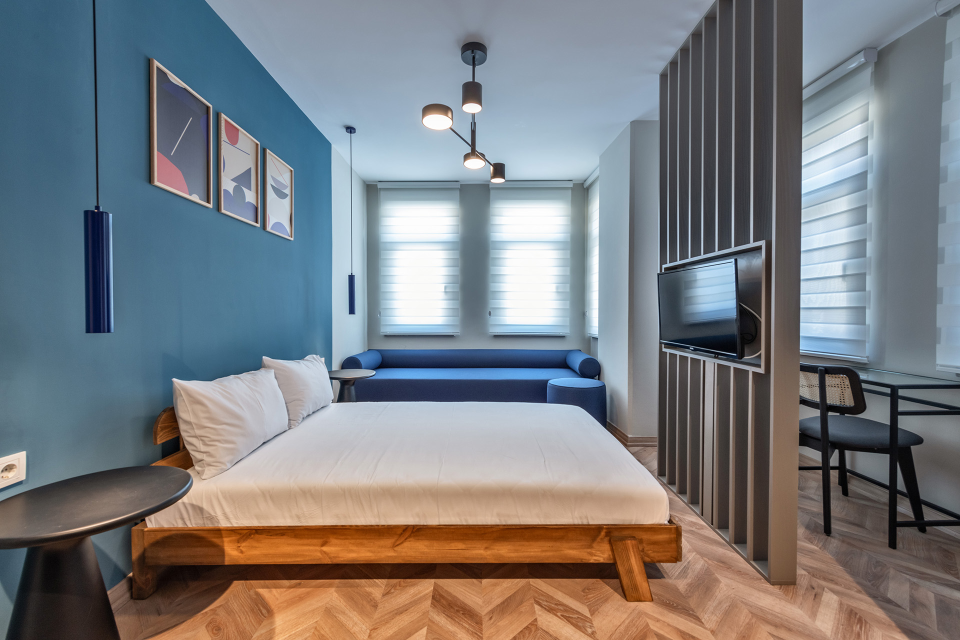 Modern stüdyo daire koleksiyonumuz, akıllı planlama ve cesur renk bloklarıyla fonksiyonelliği estetikle buluşturarak benzersiz bir mimari yaklaşım sunuyor. Ahşap bölücüler ve kompakt mutfaklar gibi detaylar, alanı en üst düzeye çıkarırken her birime özgün bir karakter kazandırıyor. Konforlu mobilyalar ve çağdaş aydınlatma ile tamamlanan bu mekanlar, misafirlere kişiselleştirilmiş ve yüksek kaliteli bir konaklama deneyimi vadediyor.