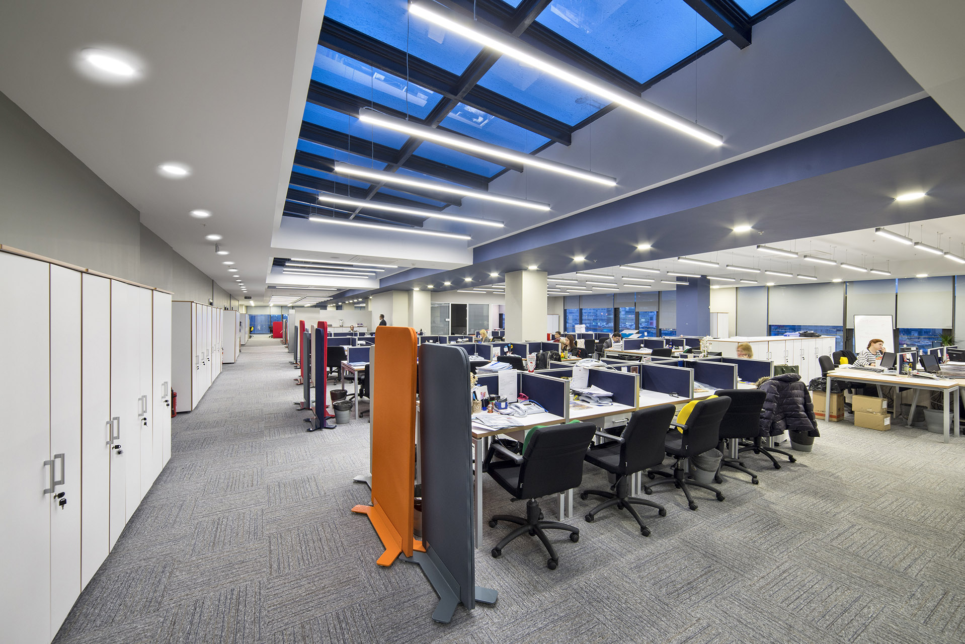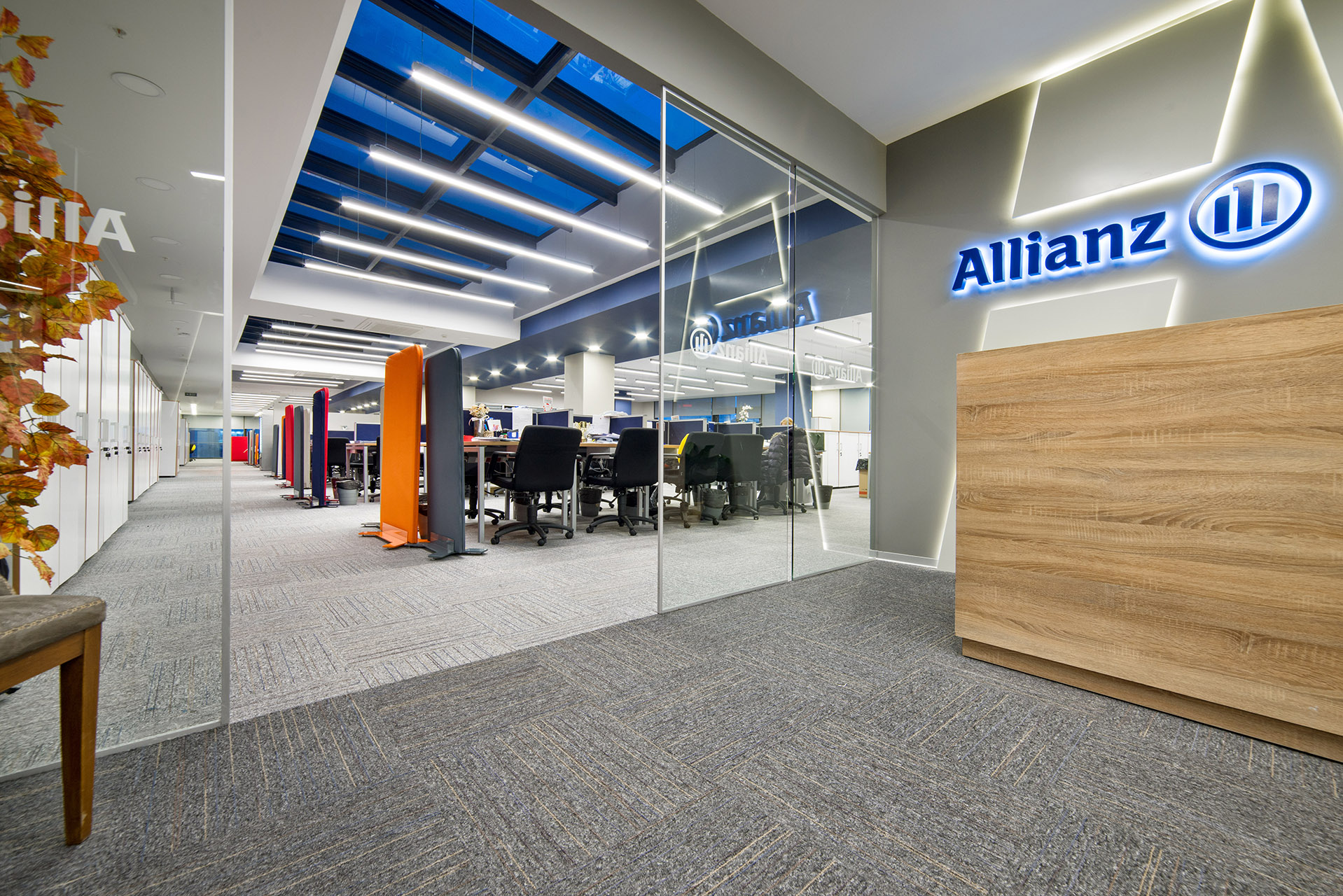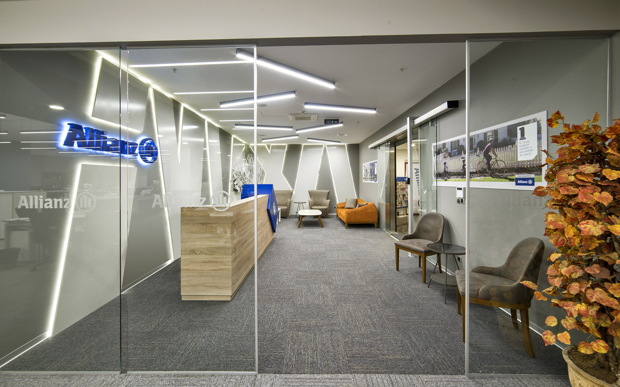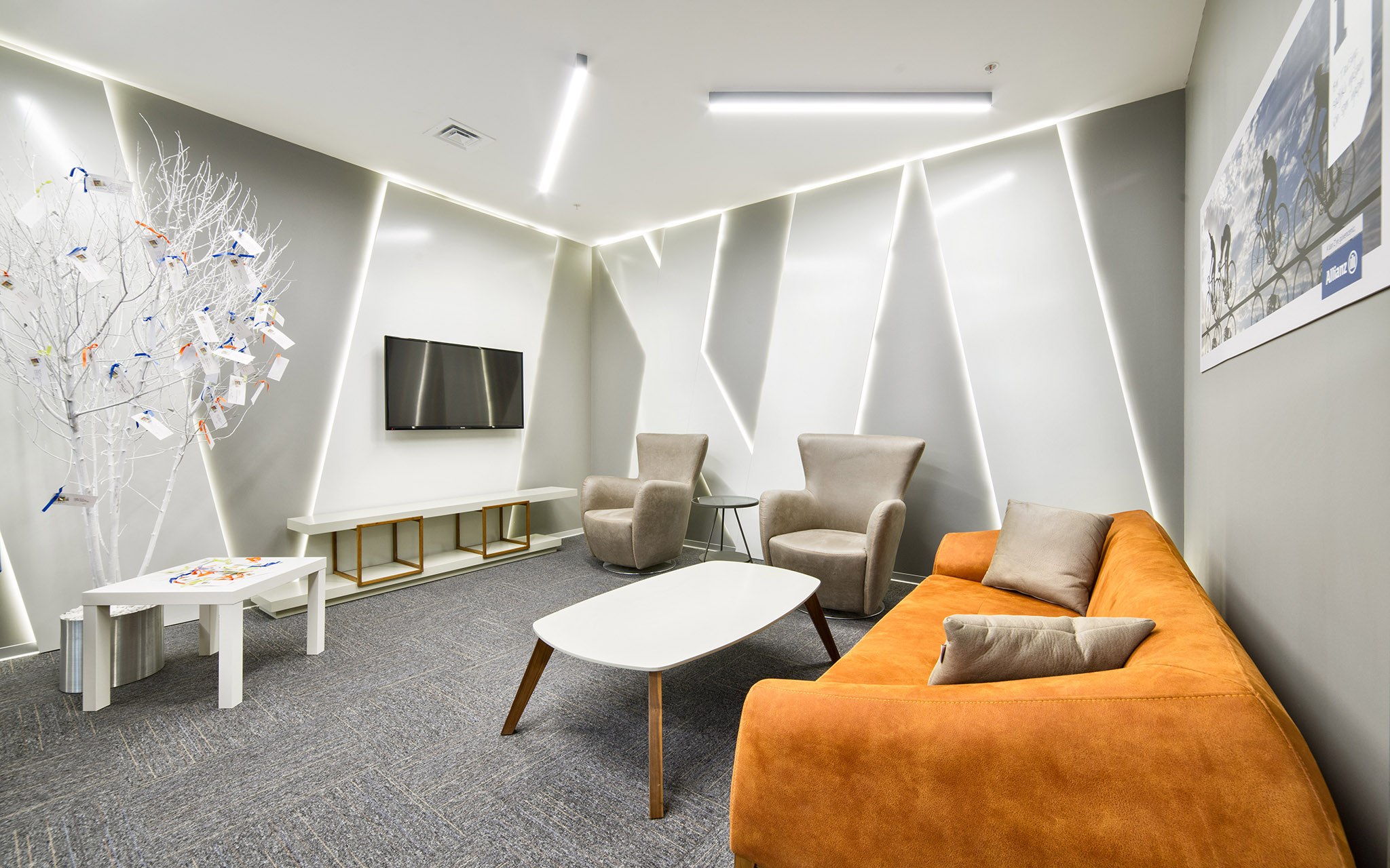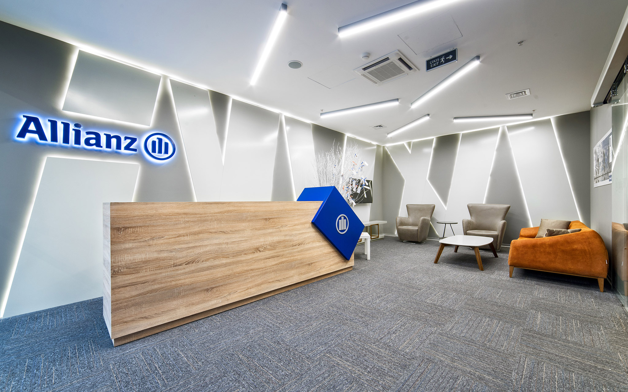 Allianz Sigorta’nın modern ve dinamik ofis tasarımı, çalışanların verimliliğini ve motivasyonunu ön planda tutan ferah bir çalışma ortamı sunmaktadır. Açık ofis alanları, ergonomik mobilyalar ve aydınlık iç mekanlar ile yenilikçi bir atmosfer yaratılırken, konforlu dinlenme köşeleri ve iyi donanımlı toplantı odaları profesyonel bir iş akışını desteklemektedir. Kurumsal mavi, beyaz ve turuncu renk paletinin şık bir şekilde entegre edildiği bu alanlar, hem iş birliğini teşvik etmekte hem de keyifli bir çalışma deneyimi sağlamaktadır.