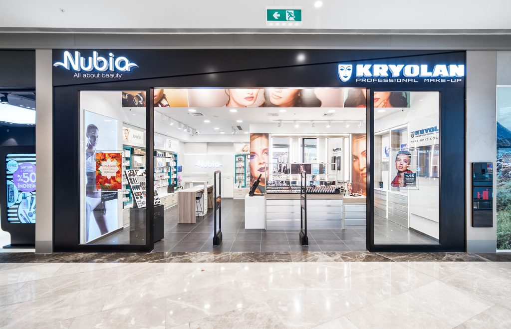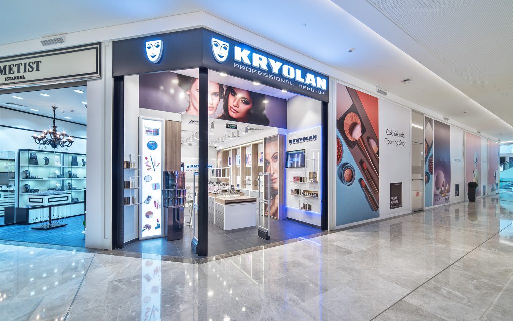 İstanbul 70m² 2017 Emaar Square Avm’de bulunan Kryolan mağaza- sında beyaz rengi ile ahşabın sıcak tonları birlikte kullanılmıştır. Yan duvarlarda makyaj üniteleri ve teşhir üniteleri kullanılırken, orta üniteler de teşhir ünitesi olarak kullanılmıştır. Giriş alanının sağ tarafında bulunan teşhir ünitesi, lansman alanı olarak kullanılıp, yeni gelen ürünlerin sergilendiği değişken sergi alanı olarak tasarlanmıştır.