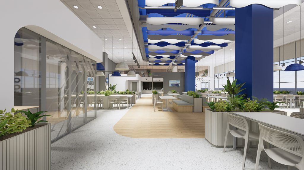 İstanbul 750m² 2025 RMK Marine yemekhanesi, kurumsal kimliği vurgulayan dinamik mavi tavan kurgusu ve akışkan mekan organizasyonuyla modern bir sosyal alan sunmaktadır. Terrazzo zemin, doğal ahşap dokular ve bitkisel öğelerin entegrasyonu ile aydınlık ve davetkar bir atmosfer yaratılmıştır.