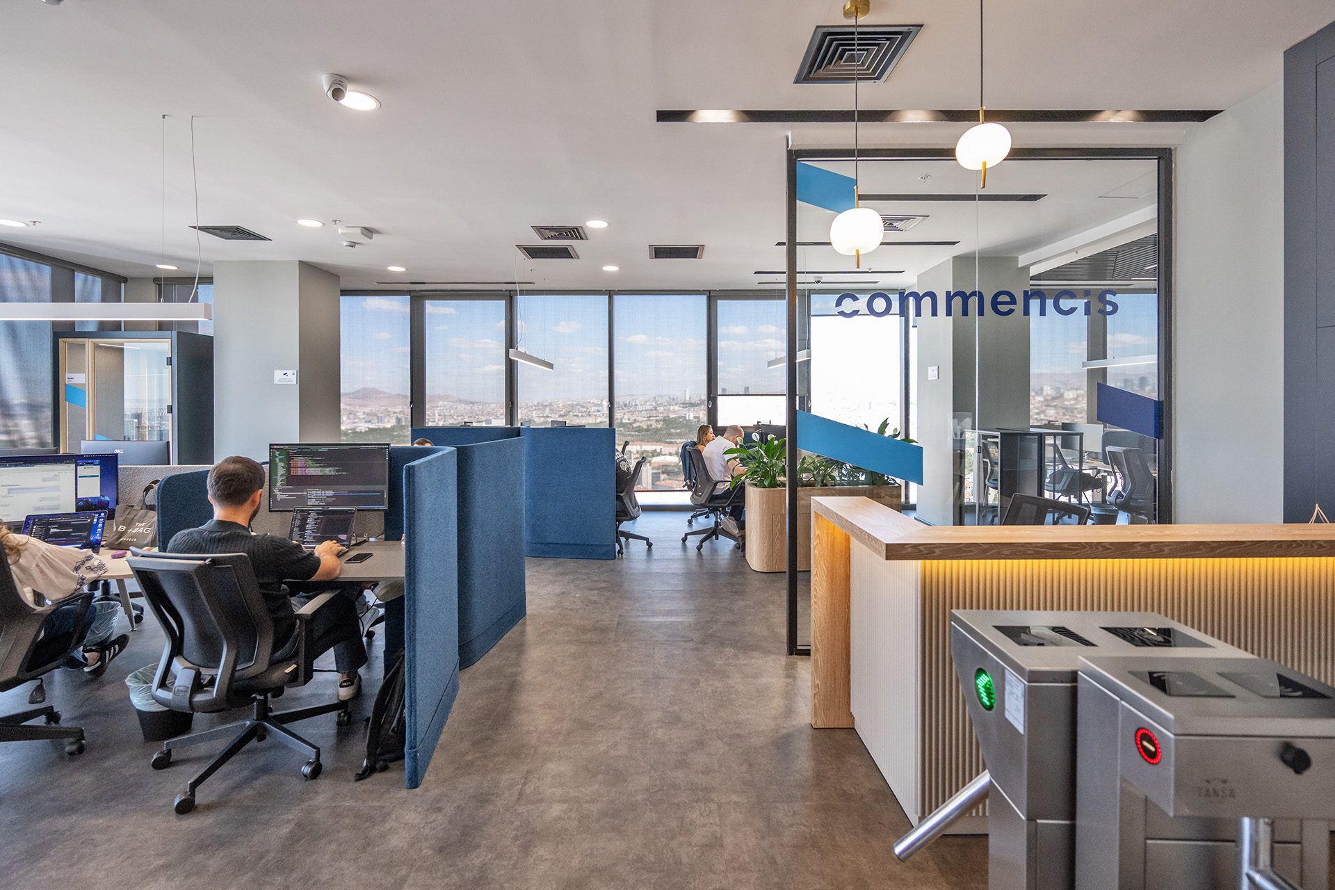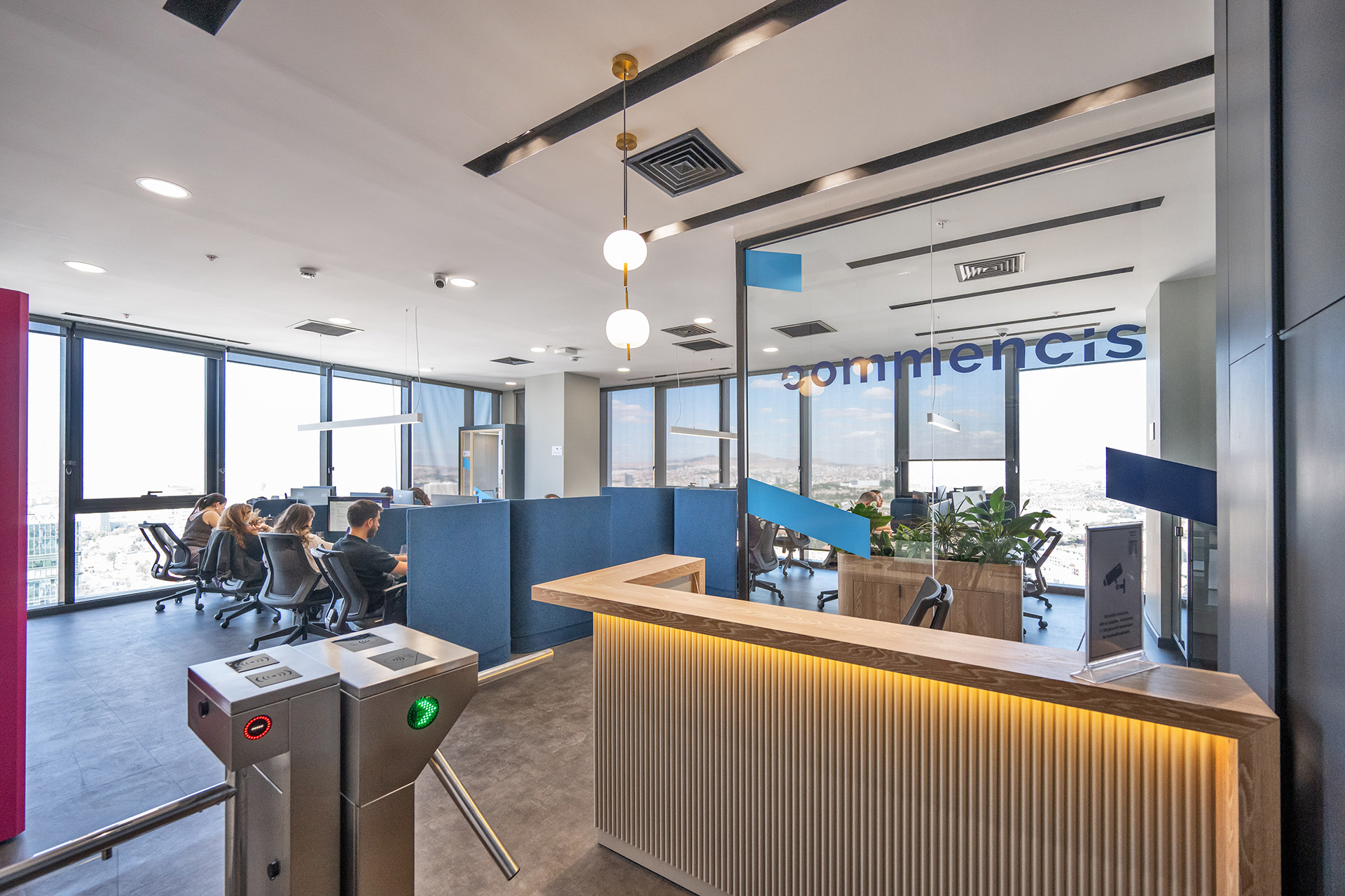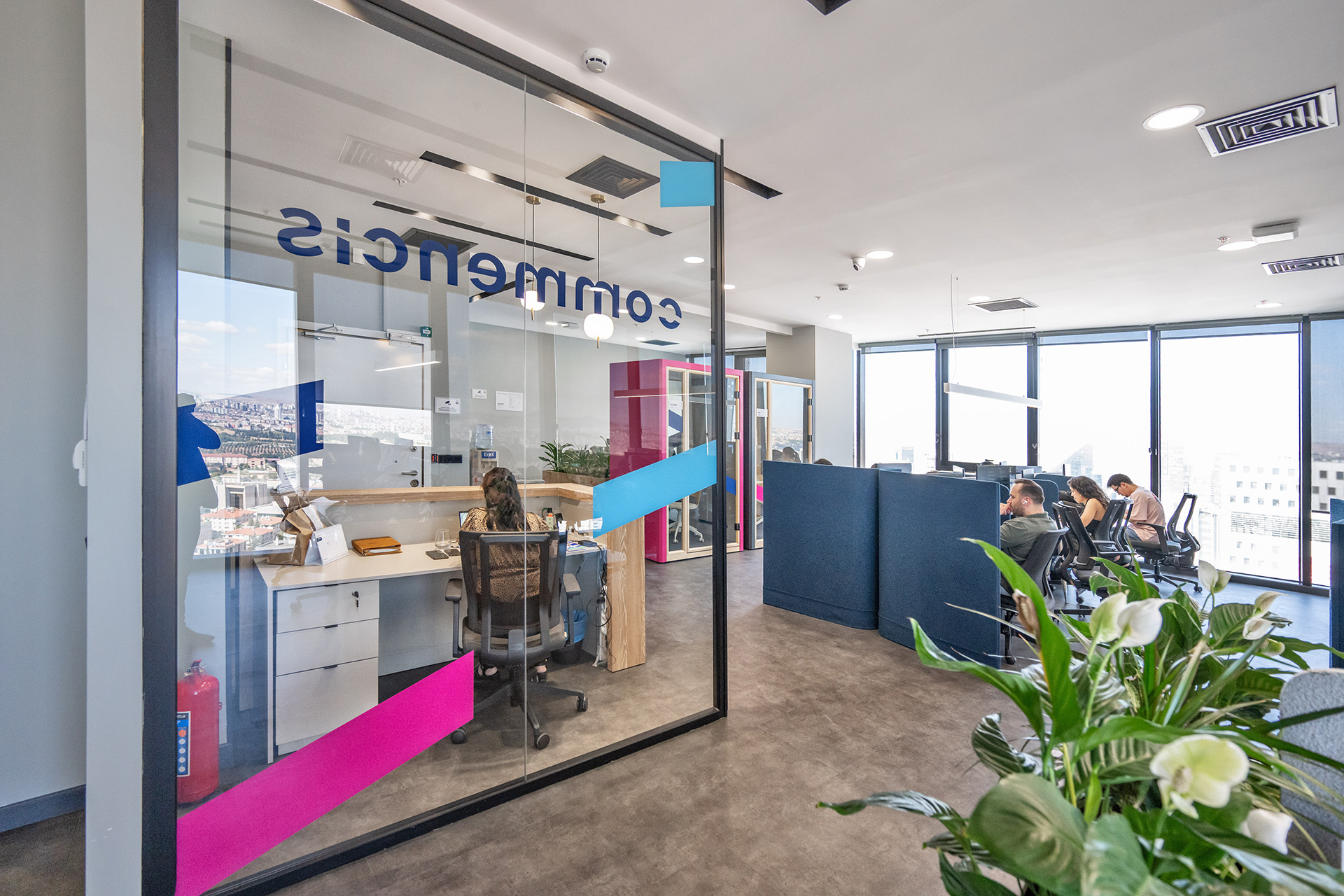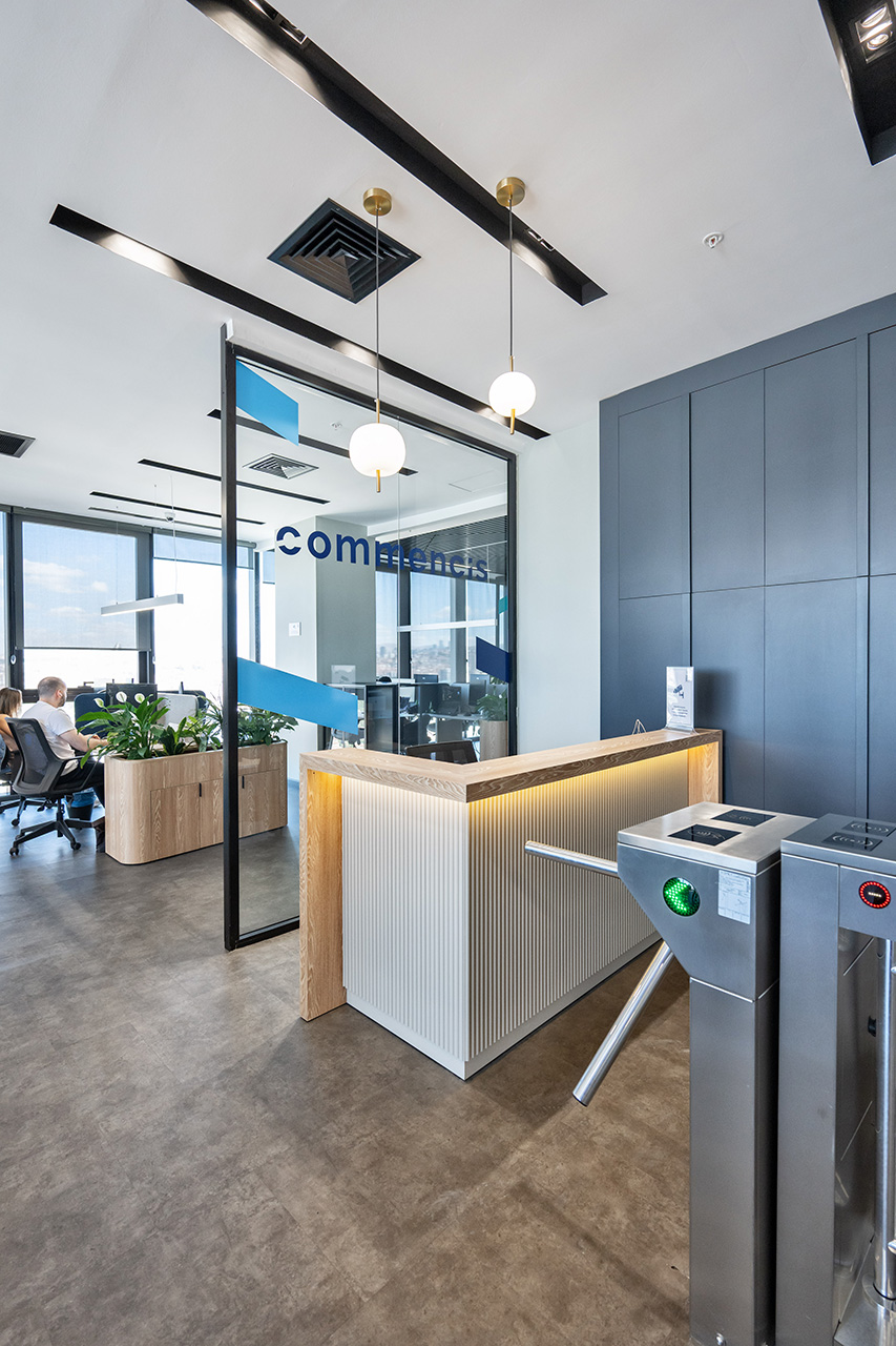 Commencis Ankara ofisinde, teknoloji odaklı kurumsal yapıyı destekleyen yenilikçi ve dinamik bir çalışma ekosistemi kurgulanmıştır. Mekâna entegre edilen canlı renkli odaklanma birimleri ve esnek sosyal alanlar sayesinde, yüksek işlevsellik ile enerjik bir atmosfer bir araya getirilmiştir. Açık ofis kurgusunda benimsenen modern tasarım dili, kullanıcı motivasyonunu en üst düzeye çıkaran ferah ve ilham verici bir yerleşim düzeni sunmuştur.
