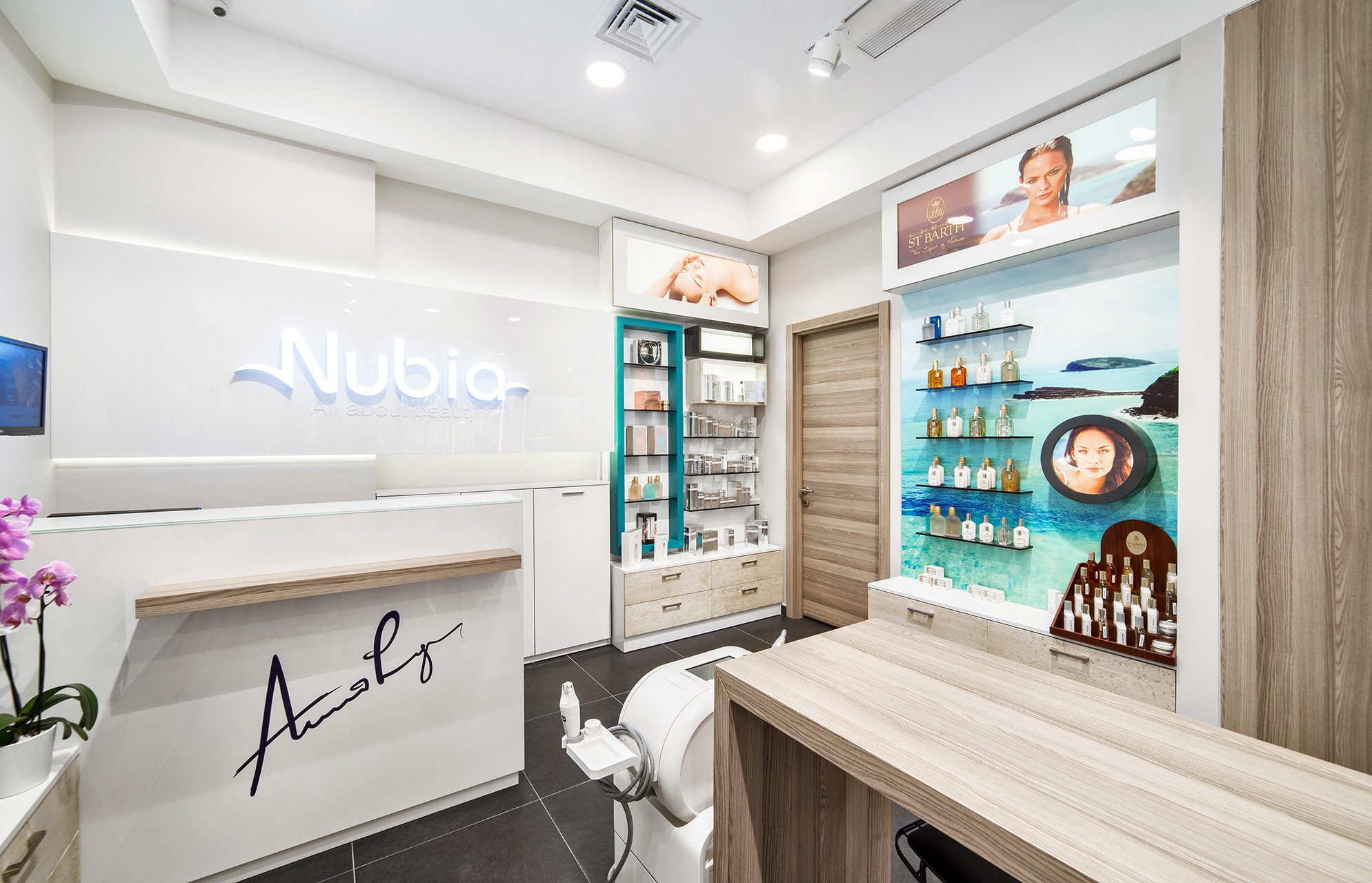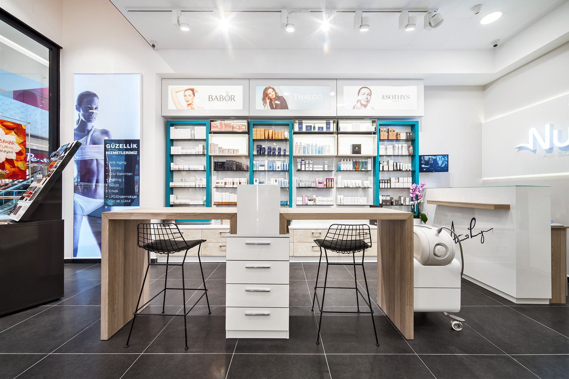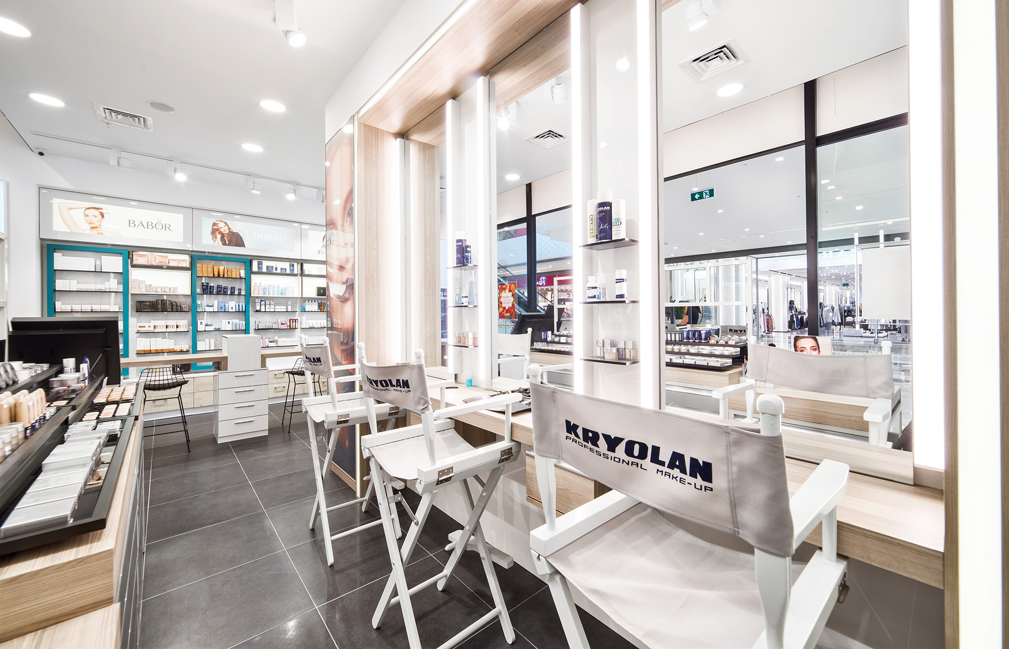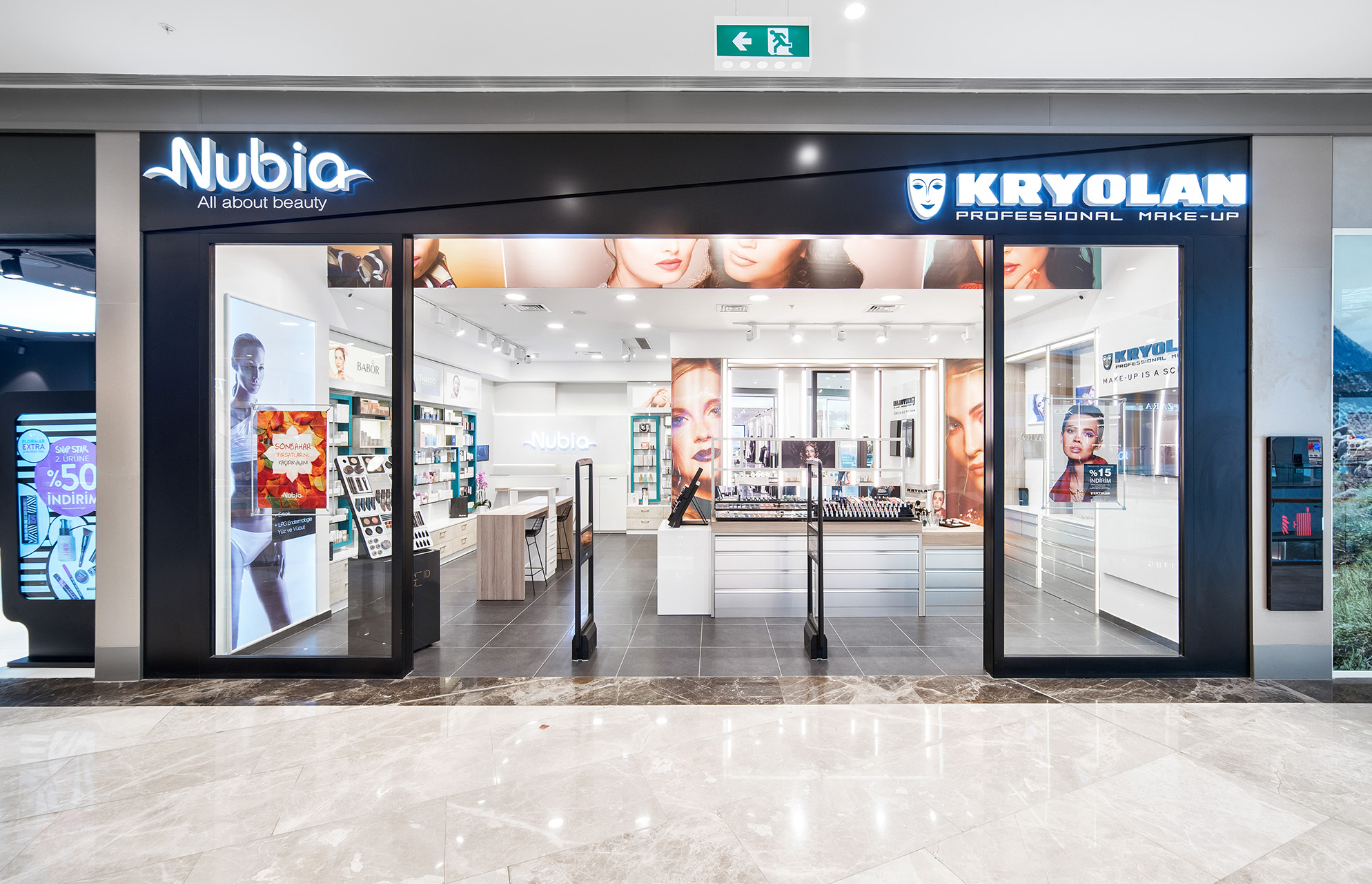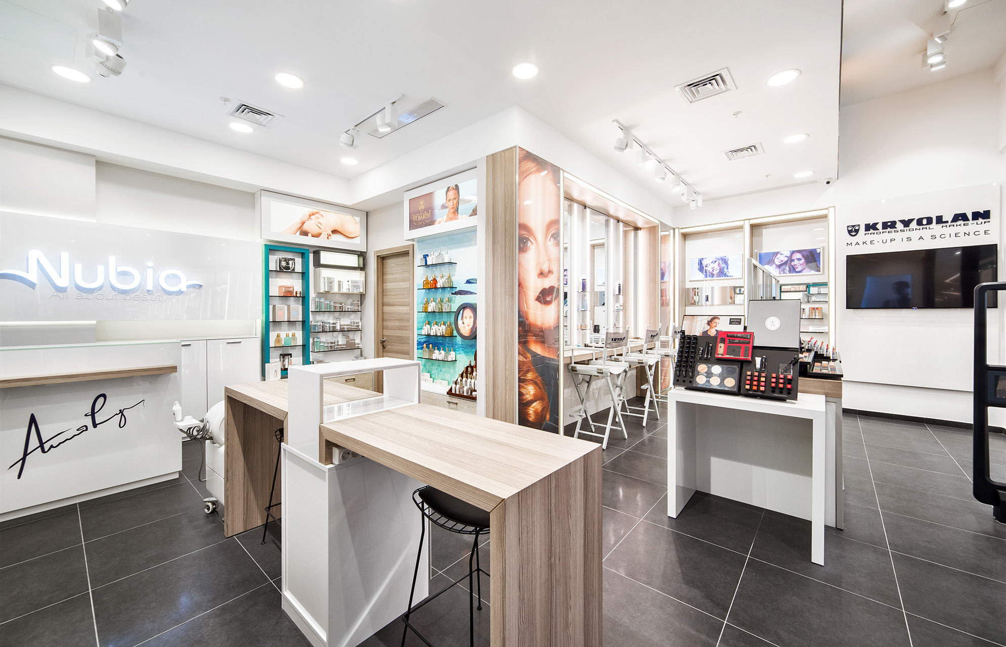 Vadi İstanbul içerisinde bulunan Kryolan Projesinde, profesyonel kozmetik deneyimini modern bir perakende kurgusuyla birleştiren yenilikçi bir tasarım dili benimsenmiştir. Saf beyaz yüzeylerin yarattığı ferahlık, kurumsal kimliği vurgulayan turkuaz detaylar ve sıcak ahşap dokularla harmonize edilerek mağaza genelinde canlı bir atmosfer oluşturulmuştur. Fonksiyonel sergileme üniteleri ve profesyonel makyaj istasyonları, müşteri deneyimini odağa alan işlevsel bir yerleşim planı çerçevesinde kurgulanmıştır.