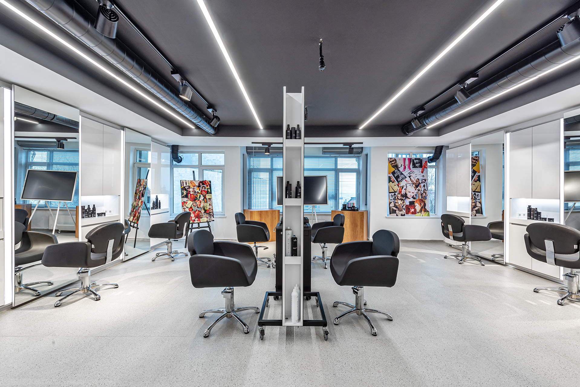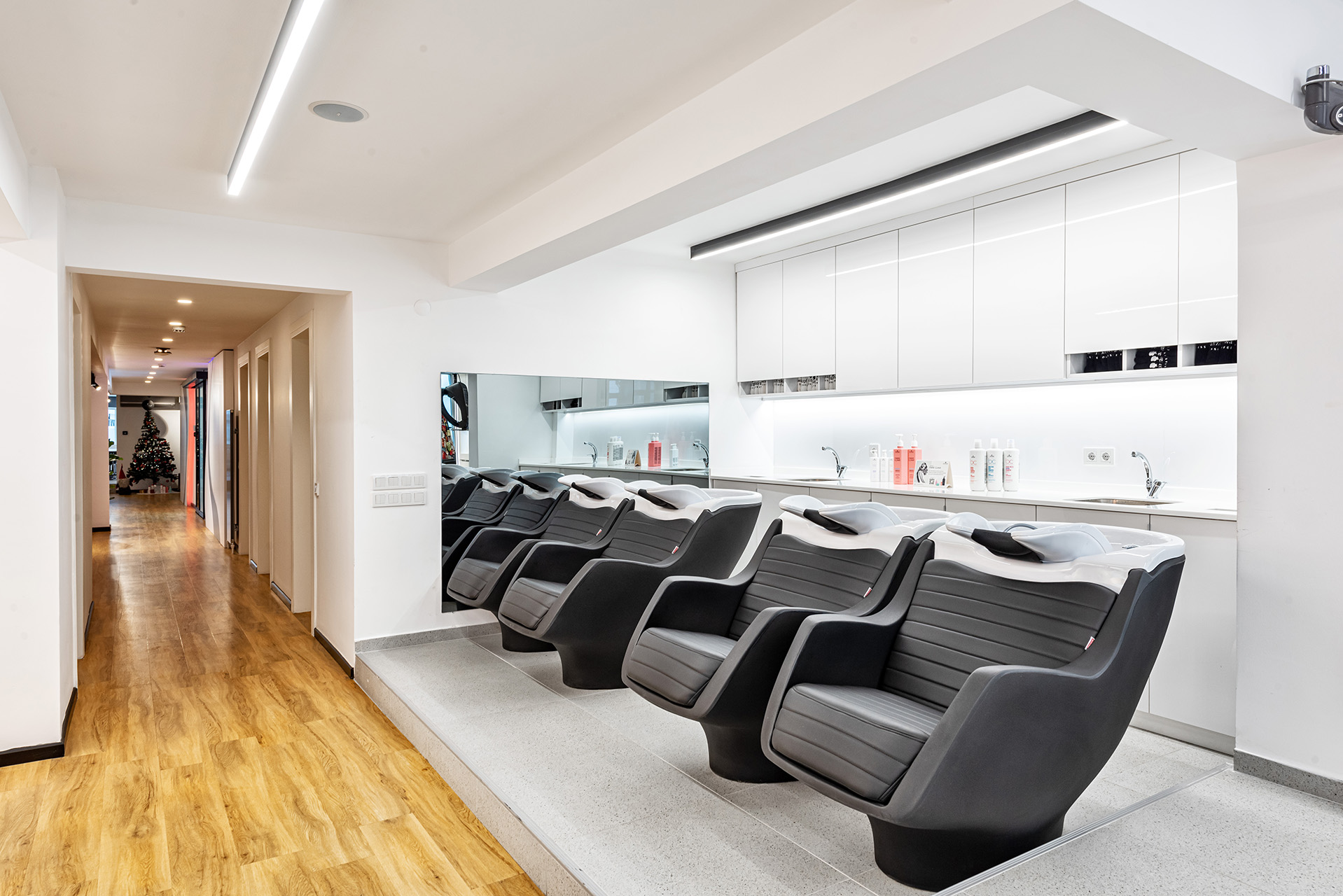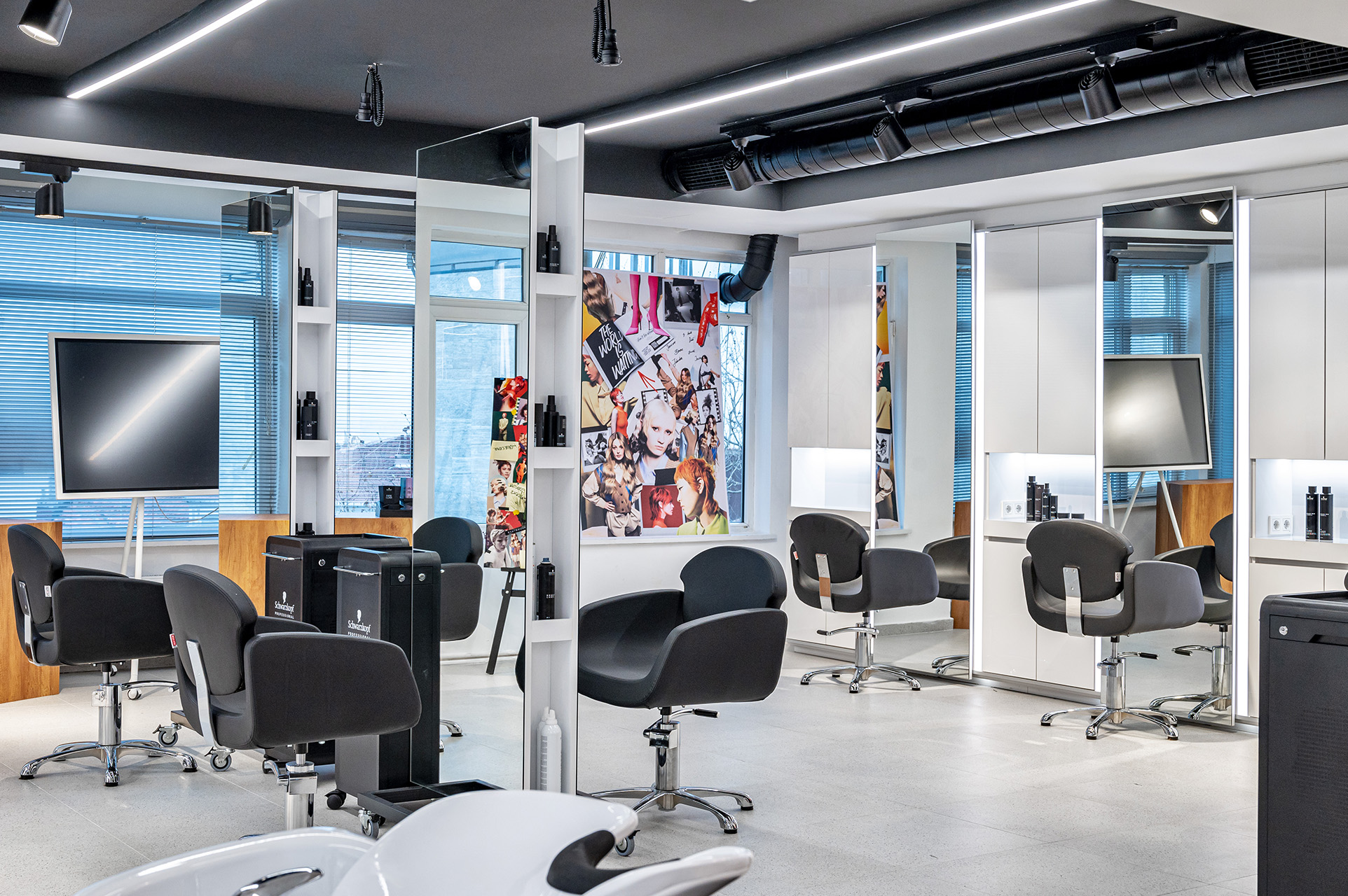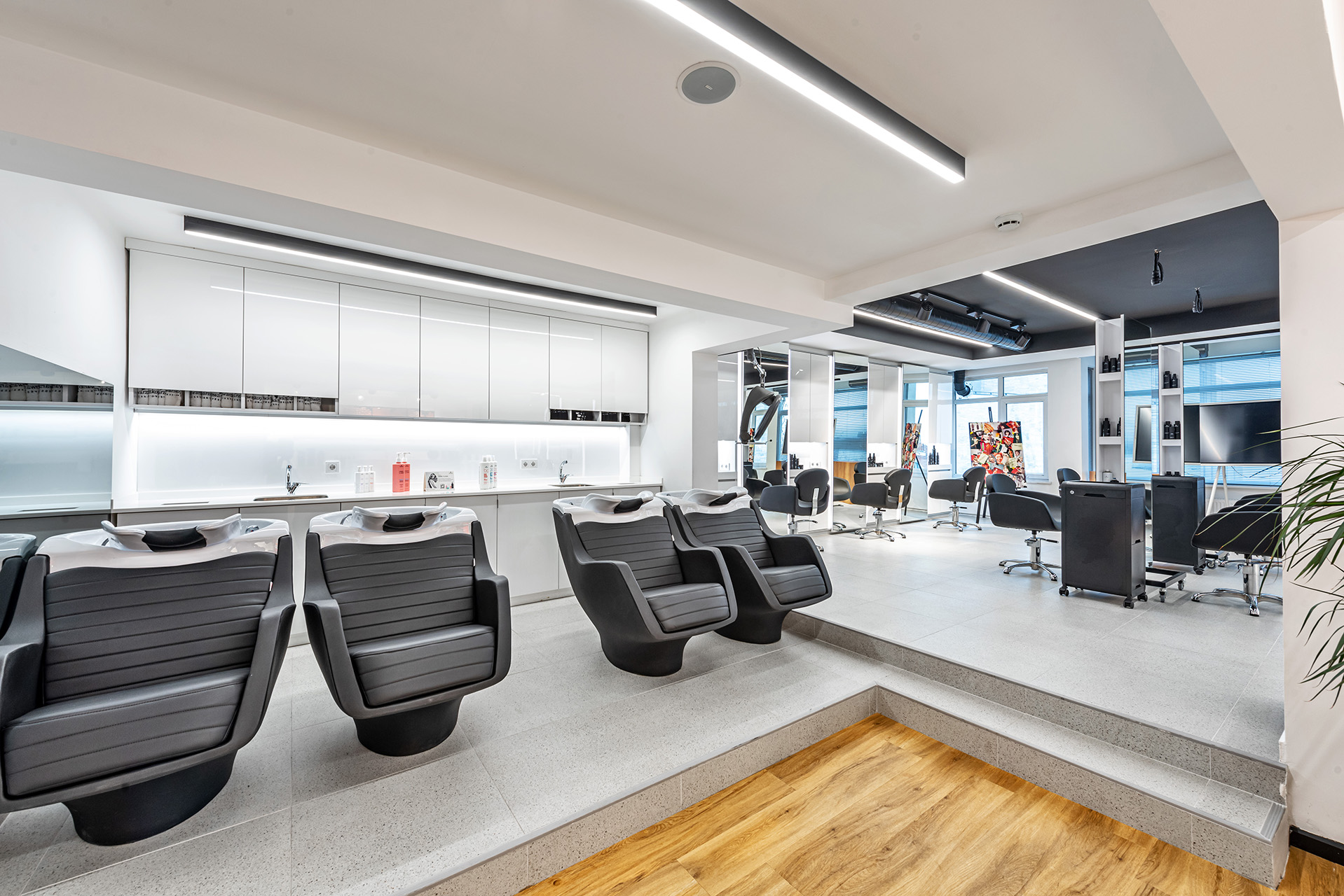 Schwarzkopf Akademi projesi, beyaz yüzeyler, siyah vurgular ve sıcak ahşap zeminlerin bir araya geldiği modern ve aydınlık bir iç mekan tasarımı sergilemektedir. Açık plan düzenlemesi, kesim istasyonları, yıkama alanı ve eğitim odası gibi farklı işlevsel bölgelerin net bir şekilde tanımlanmasını sağlamaktadır. Lineer LED aydınlatma ve spot armatürlerin kullanımı, mekanı vurgularken aynı zamanda ferah ve profesyonel bir atmosfer yaratmaktadır.