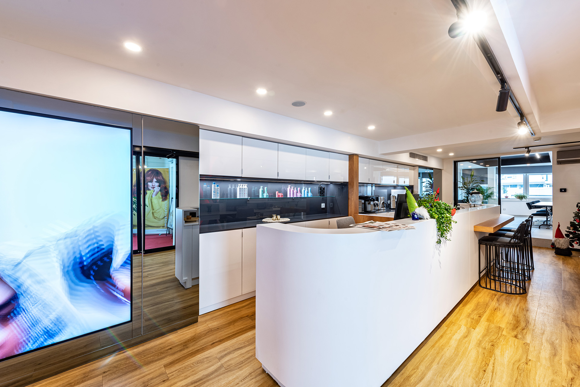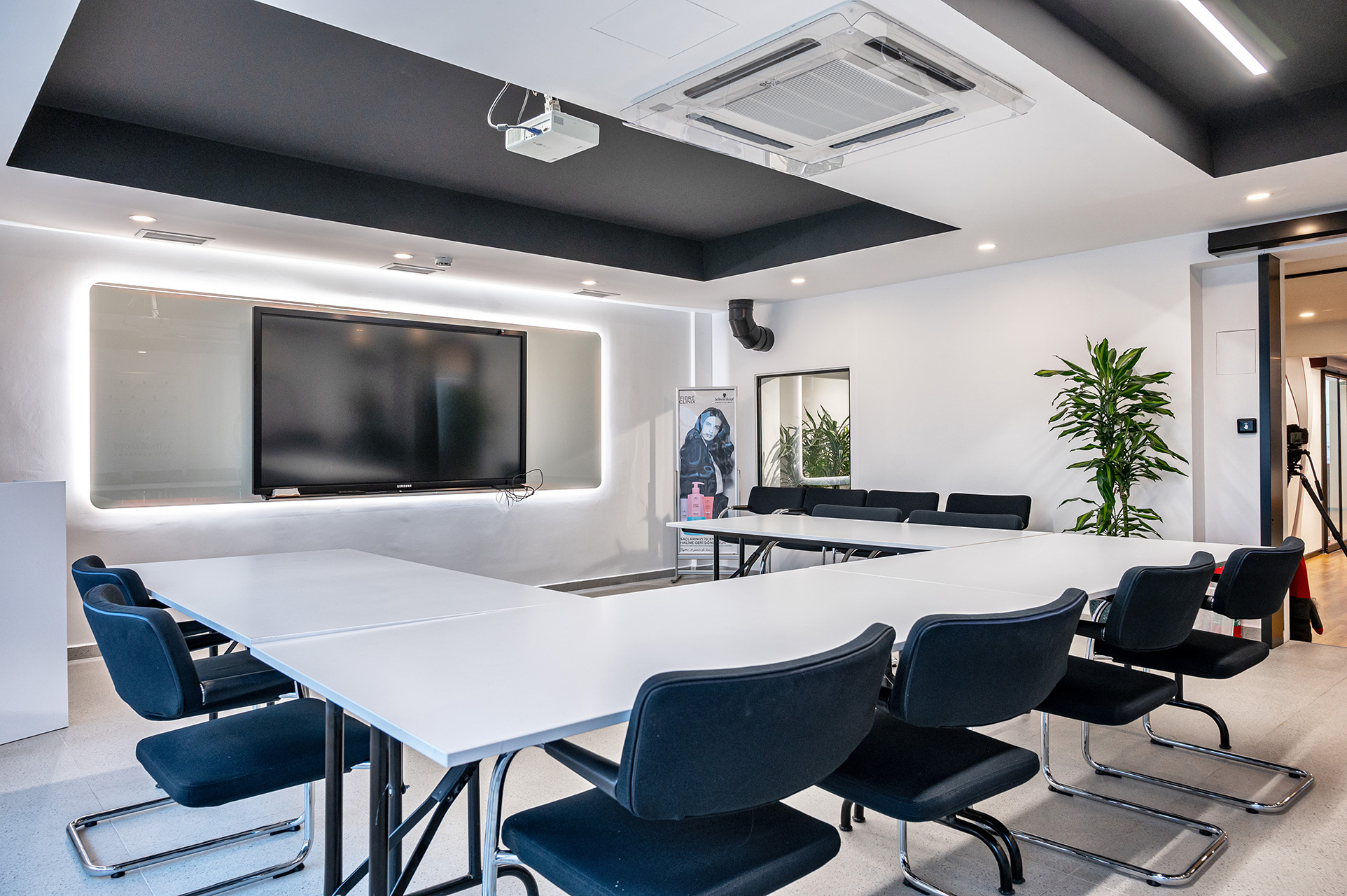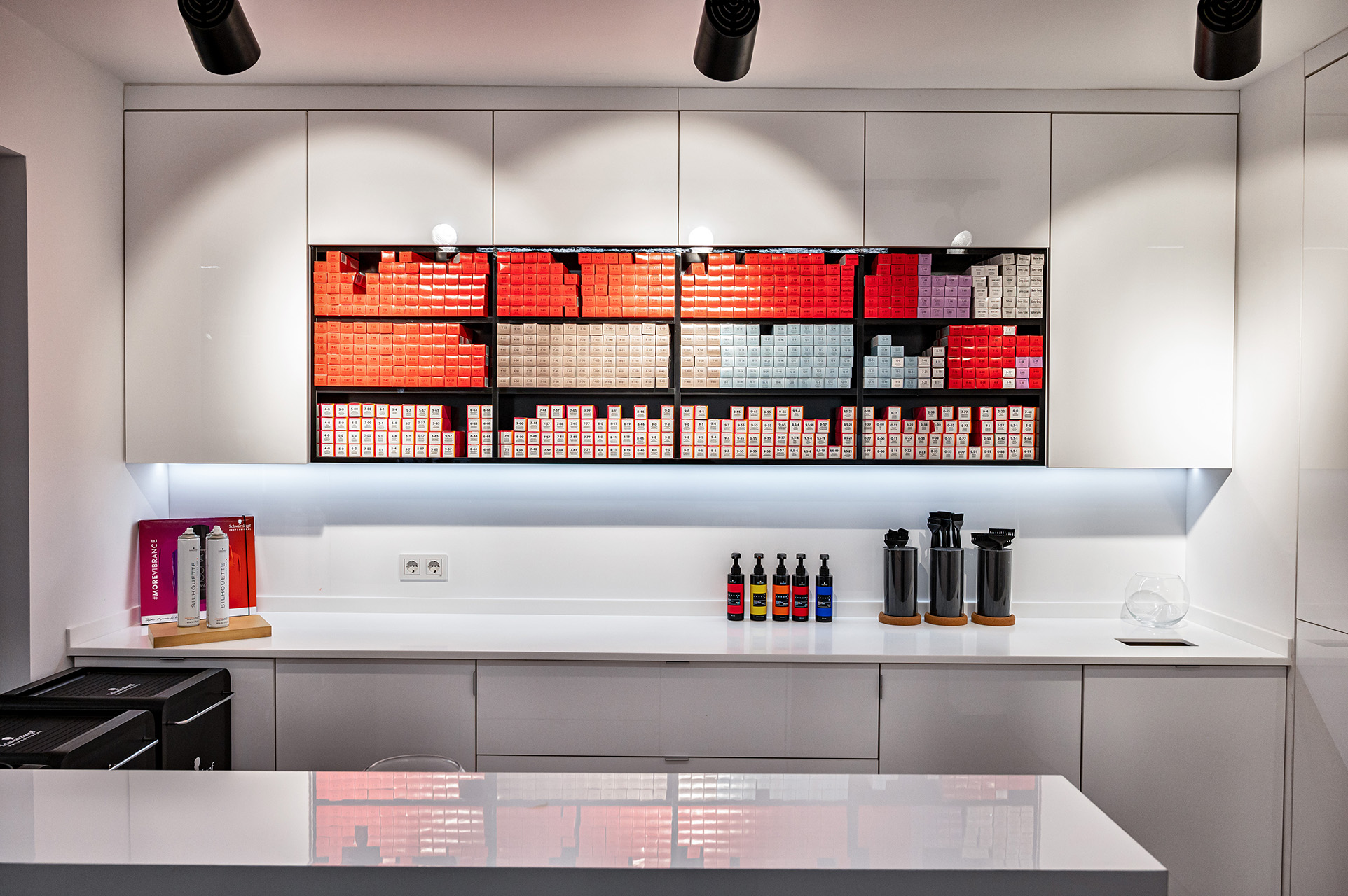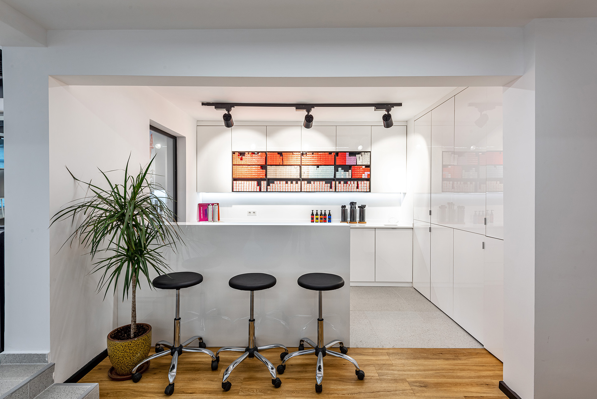 Schwarzkopf Akademi projesi, beyaz yüzeyler, siyah vurgular ve sıcak ahşap zeminlerin bir araya geldiği modern ve aydınlık bir iç mekan tasarımı sergilemektedir. Açık plan düzenlemesi, kesim istasyonları, yıkama alanı ve eğitim odası gibi farklı işlevsel bölgelerin net bir şekilde tanımlanmasını sağlamaktadır. Lineer LED aydınlatma ve spot armatürlerin kullanımı, mekanı vurgularken aynı zamanda ferah ve profesyonel bir atmosfer yaratmaktadır.