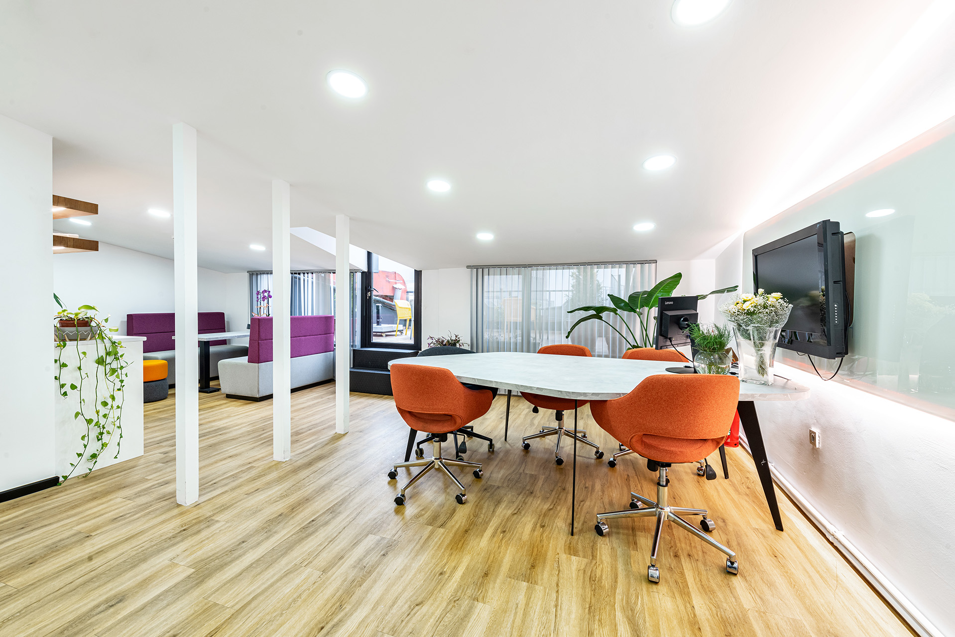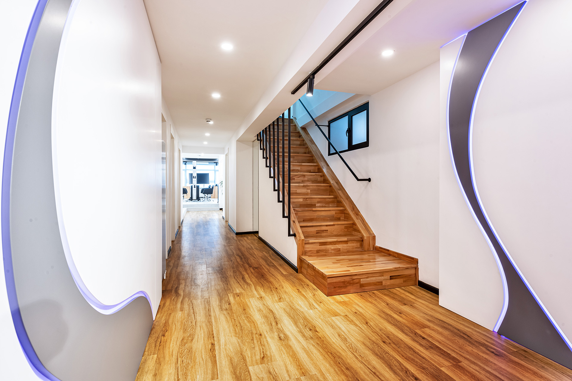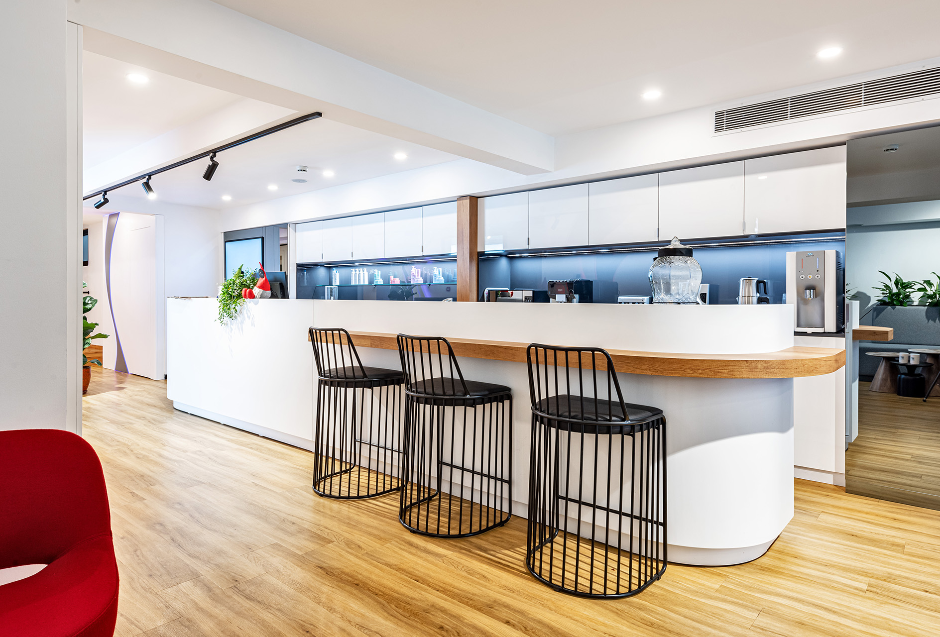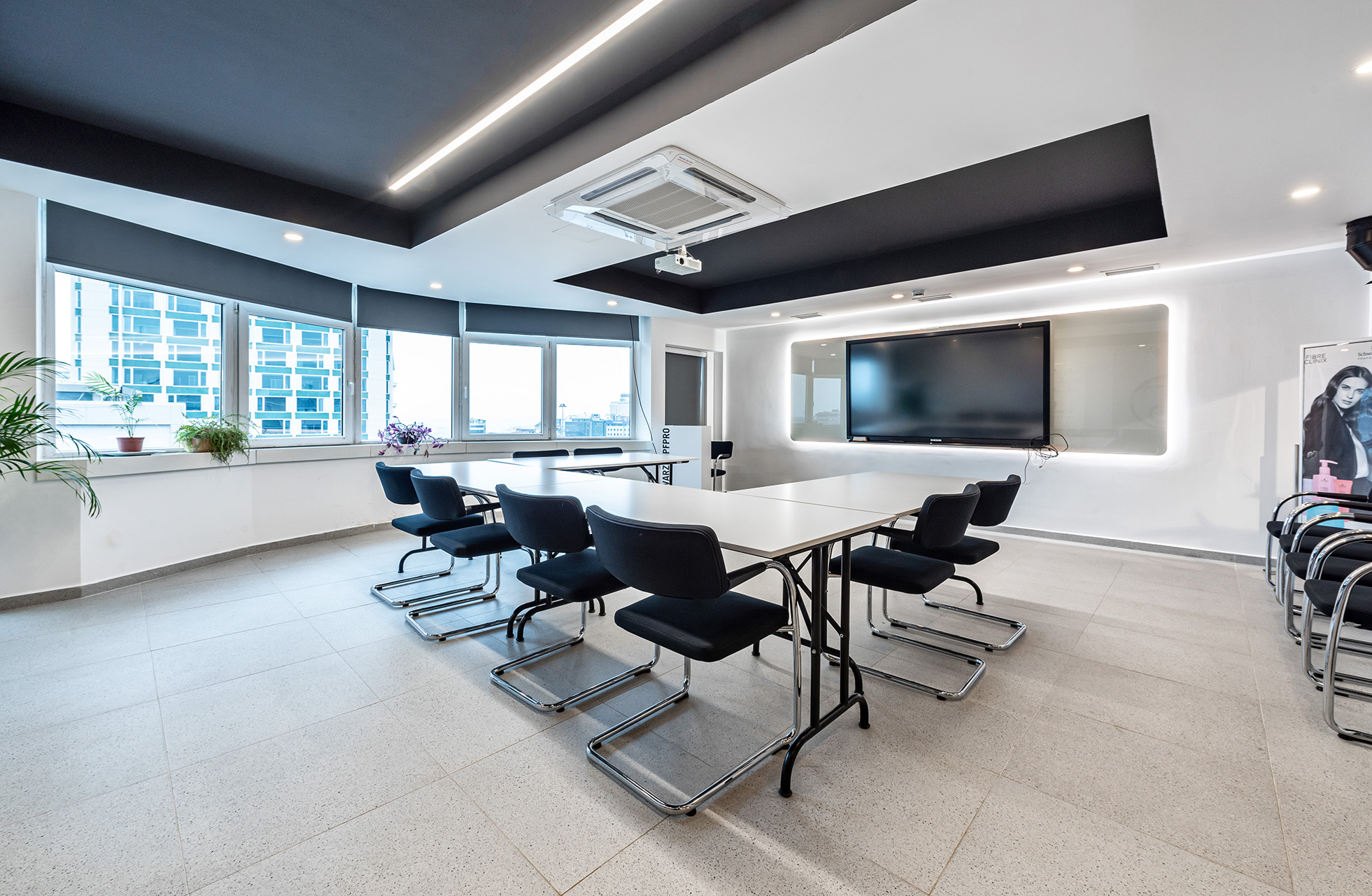Schwarzkopf Akademi projesi, beyaz yüzeyler, siyah vurgular ve sıcak ahşap zeminlerin bir araya geldiği modern ve aydınlık bir iç mekan tasarımı sergilemektedir. Açık plan düzenlemesi, kesim istasyonları, yıkama alanı ve eğitim odası gibi farklı işlevsel bölgelerin net bir şekilde tanımlanmasını sağlamaktadır. Lineer LED aydınlatma ve spot armatürlerin kullanımı, mekanı vurgularken aynı zamanda ferah ve profesyonel bir atmosfer yaratmaktadır.
