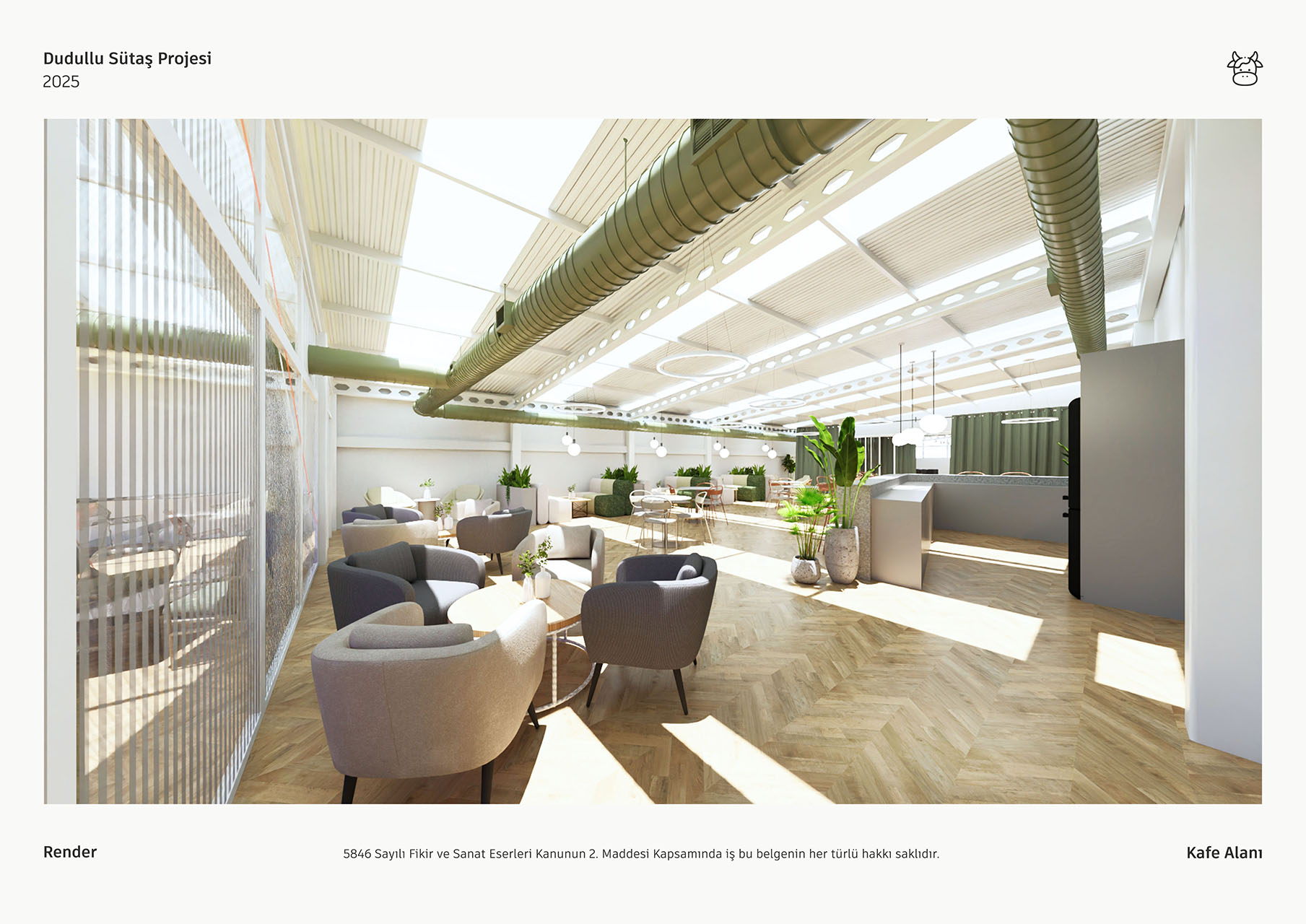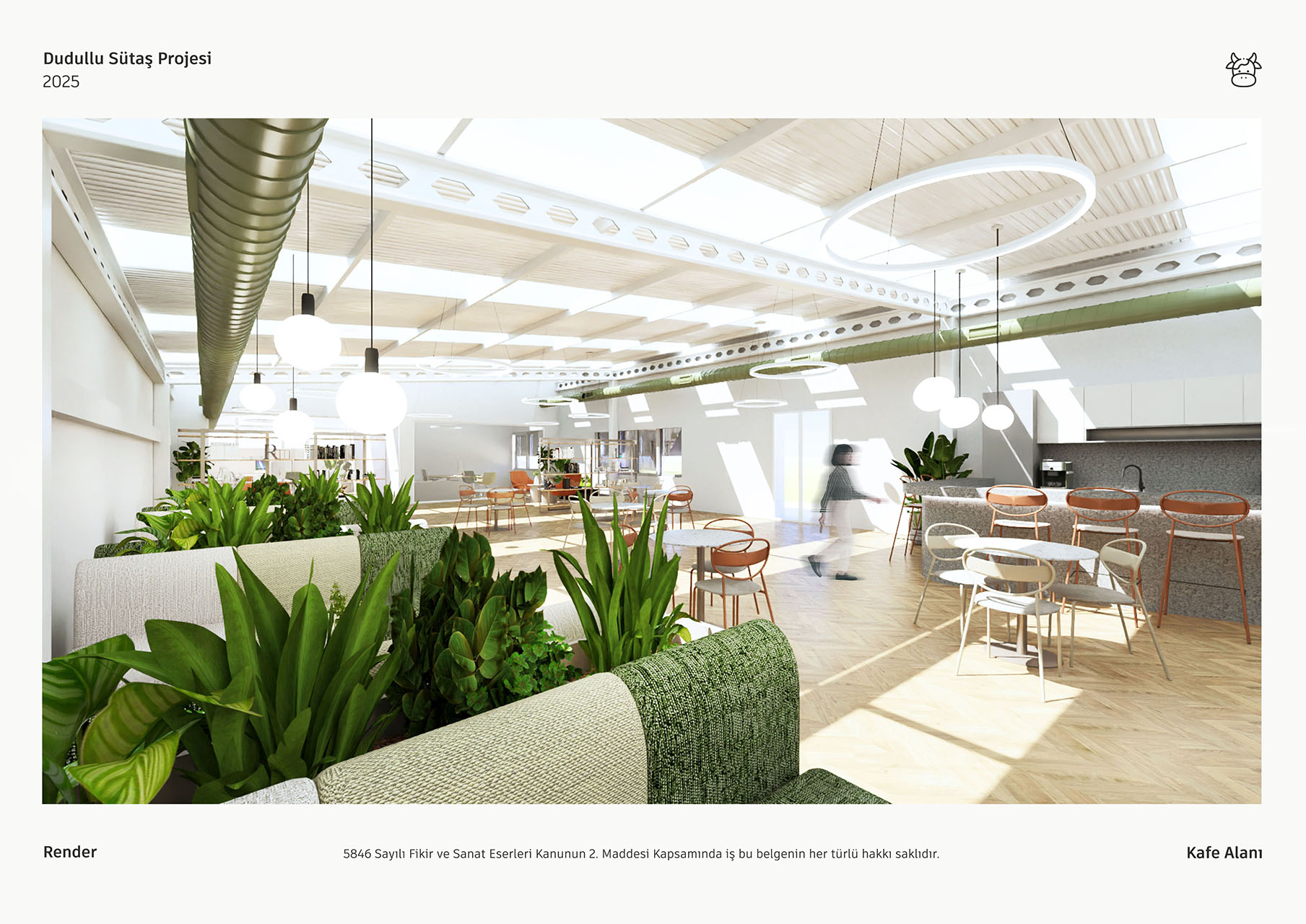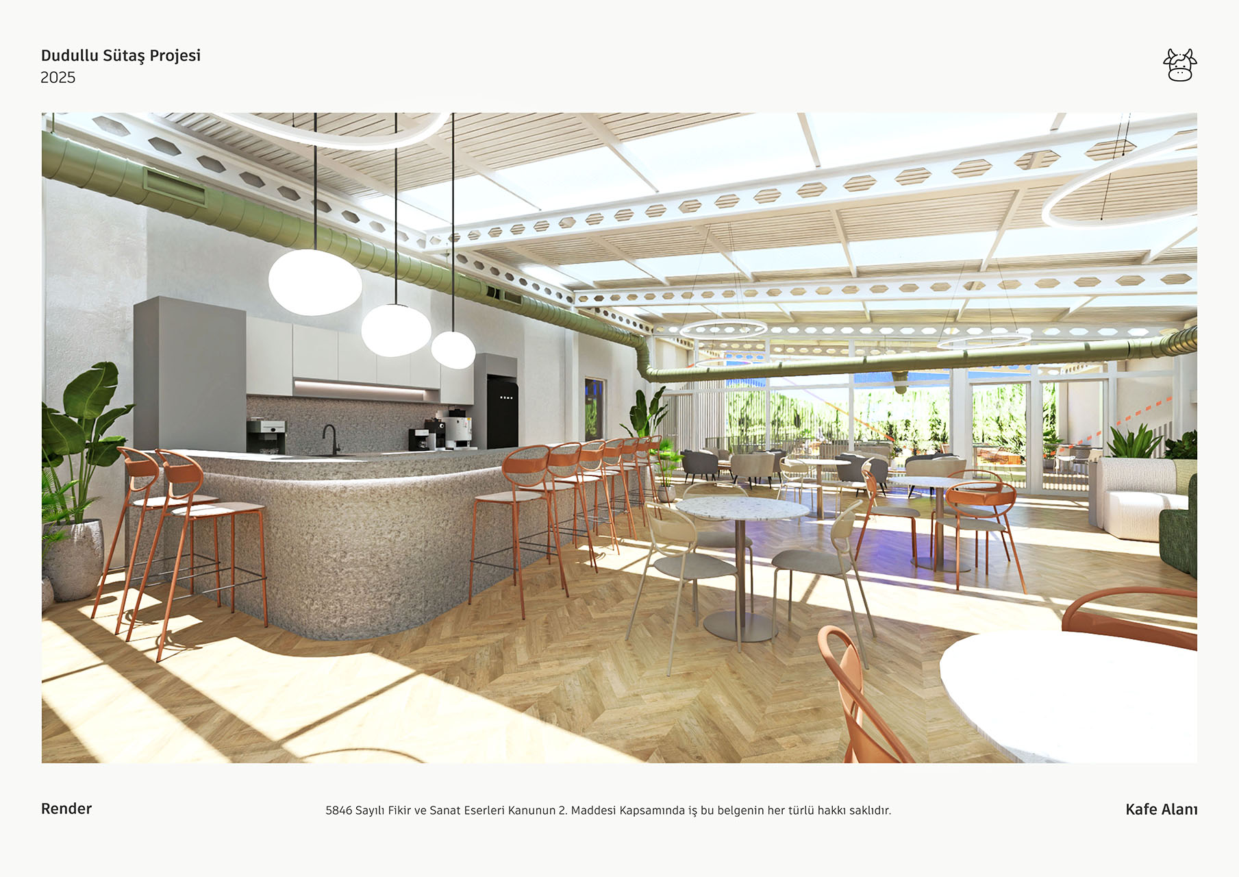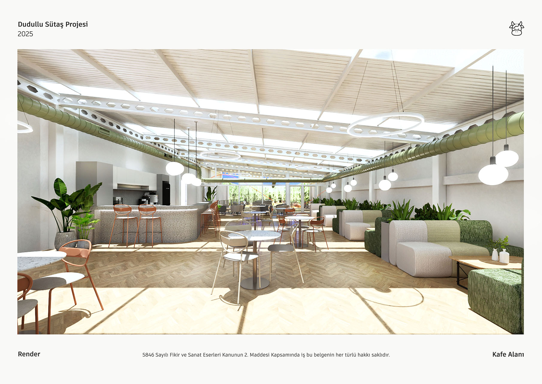 Sütaş yemekhane projesi, geniş pencerelerinden süzülen doğal ışık ve yüksek tavanlarıyla ferah, aydınlık bir mimari sunmaktadır. Endüstriyel çatı elemanlarının ahşap zeminler ve bol yeşil bitkilerle birleşimi, mekana modern ve sıcak bir atmosfer kazandırmaktadır. Farklı oturma alanları ile esnek, sosyal bir deneyim sağlayan tasarım, markanın kimliğini yansıtan özgün detaylarla tamamlanmıştır.