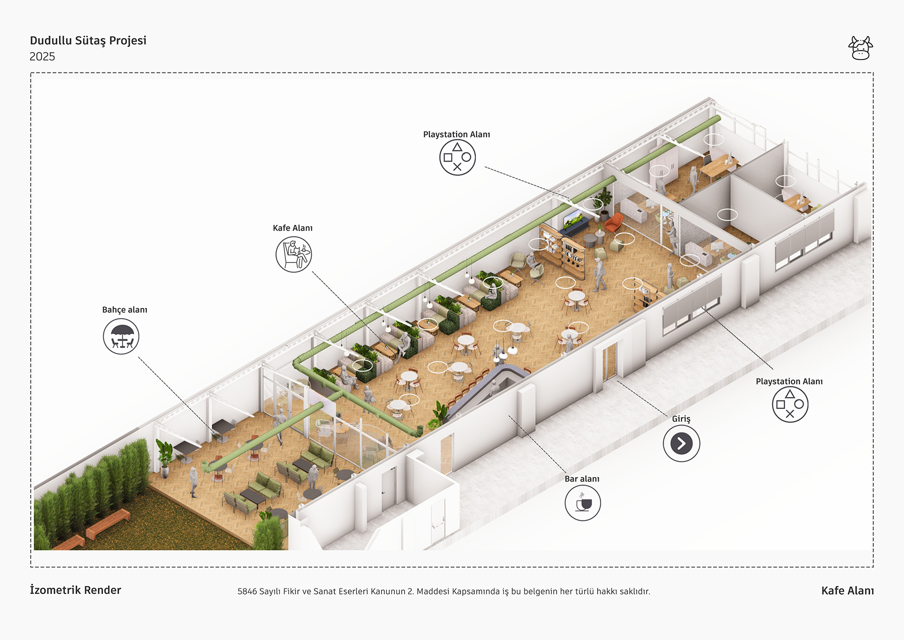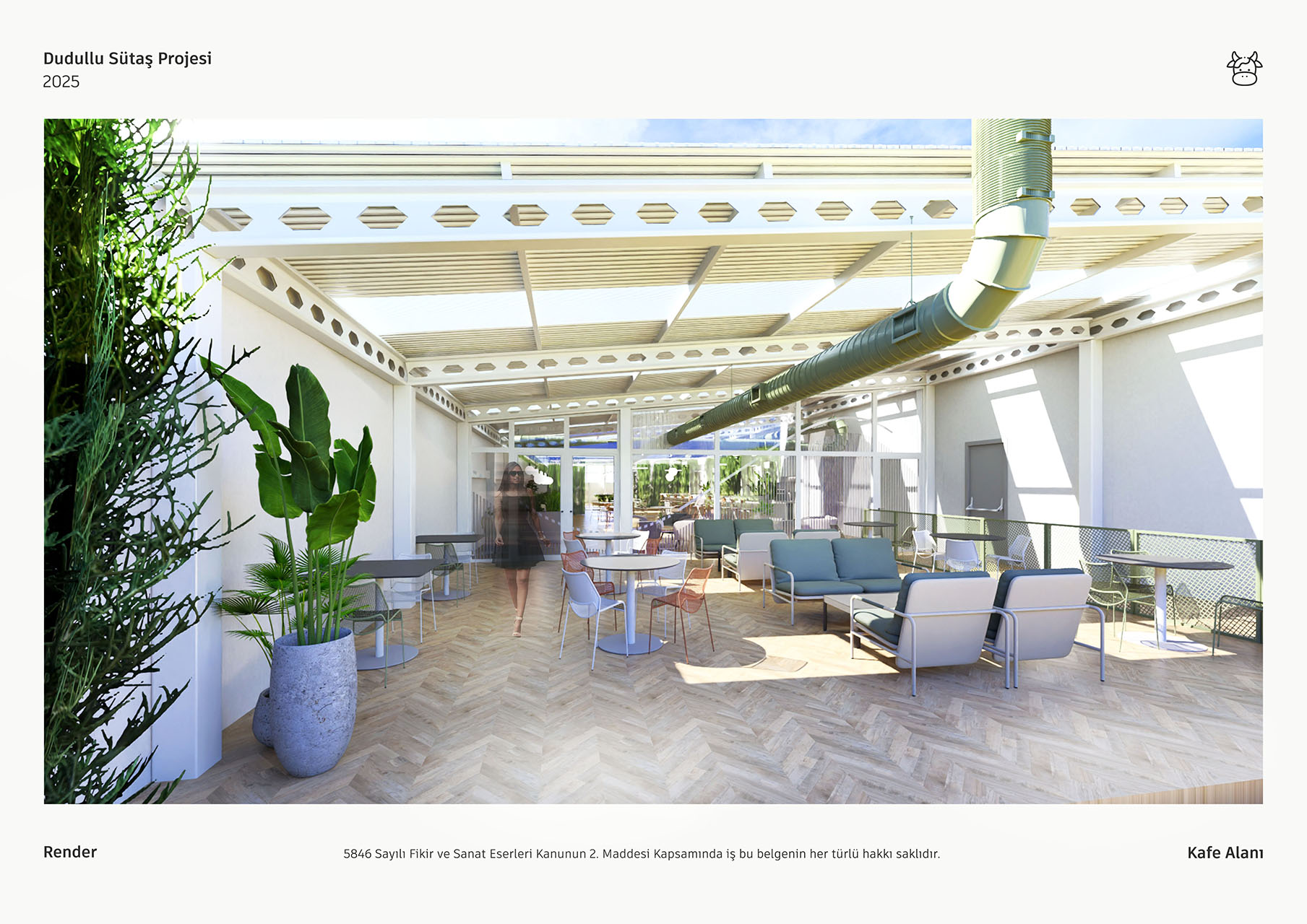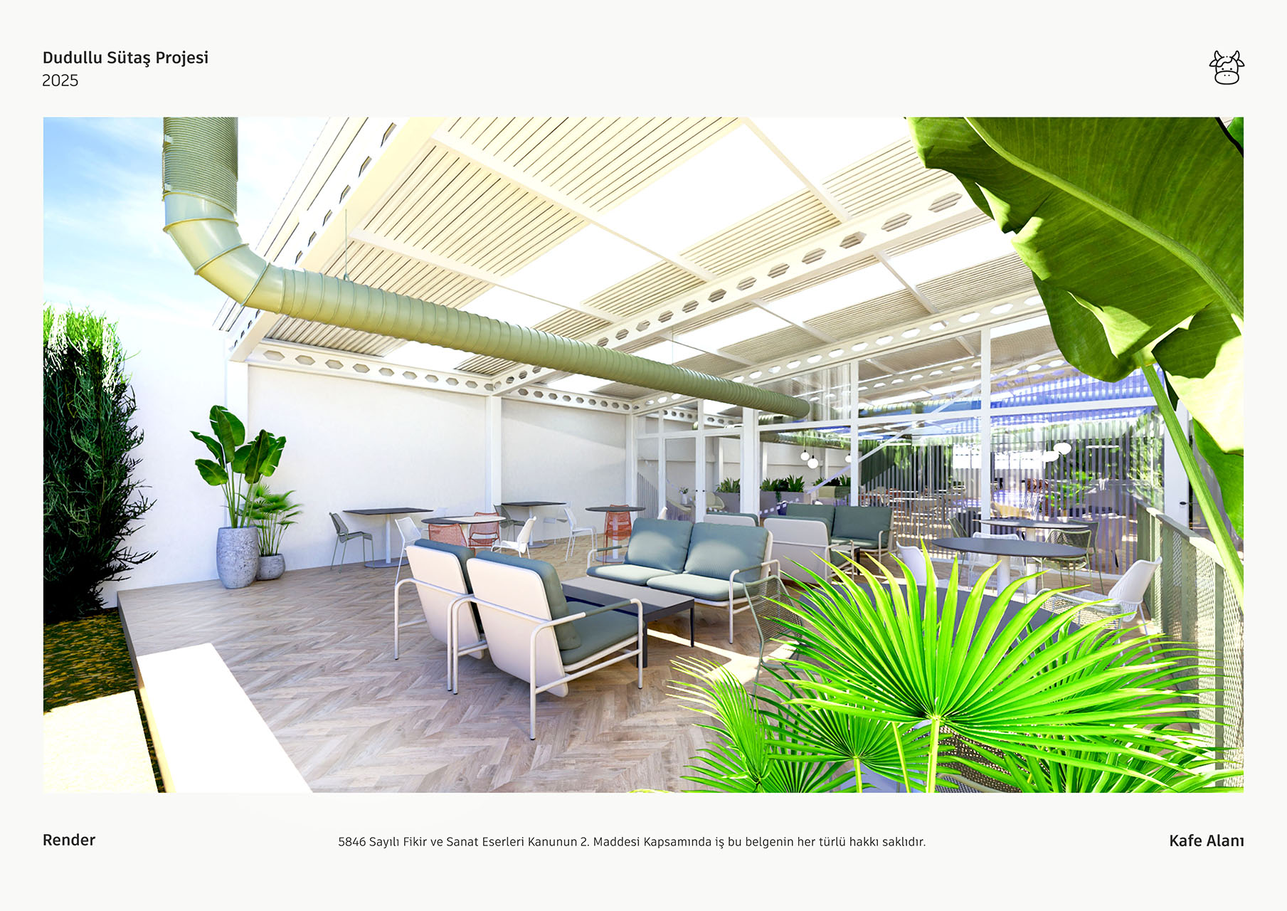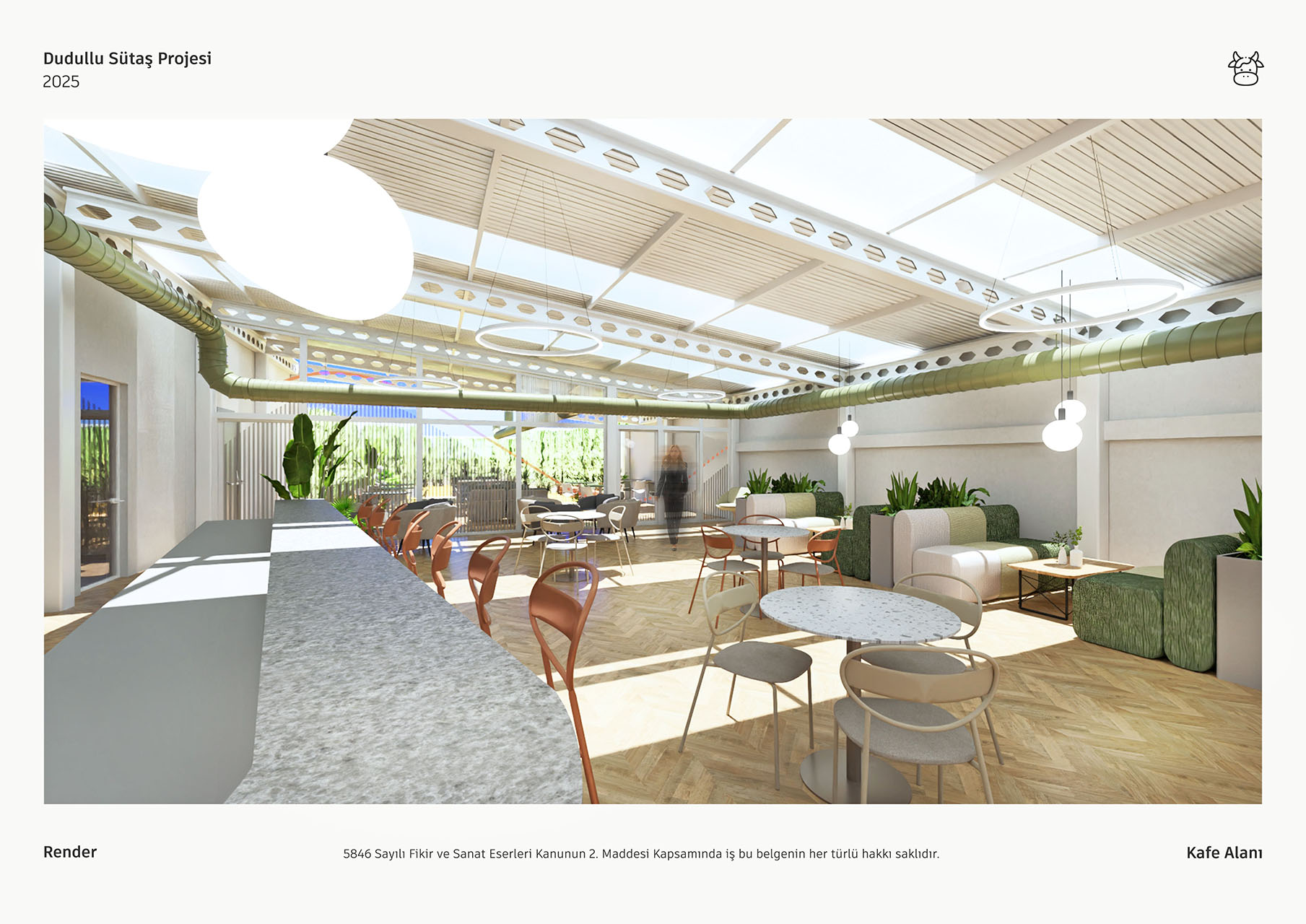 Sütaş yemekhane projesi, geniş pencerelerinden süzülen doğal ışık ve yüksek tavanlarıyla ferah, aydınlık bir mimari sunmaktadır. Endüstriyel çatı elemanlarının ahşap zeminler ve bol yeşil bitkilerle birleşimi, mekana modern ve sıcak bir atmosfer kazandırmaktadır. Farklı oturma alanları ile esnek, sosyal bir deneyim sağlayan tasarım, markanın kimliğini yansıtan özgün detaylarla tamamlanmıştır.